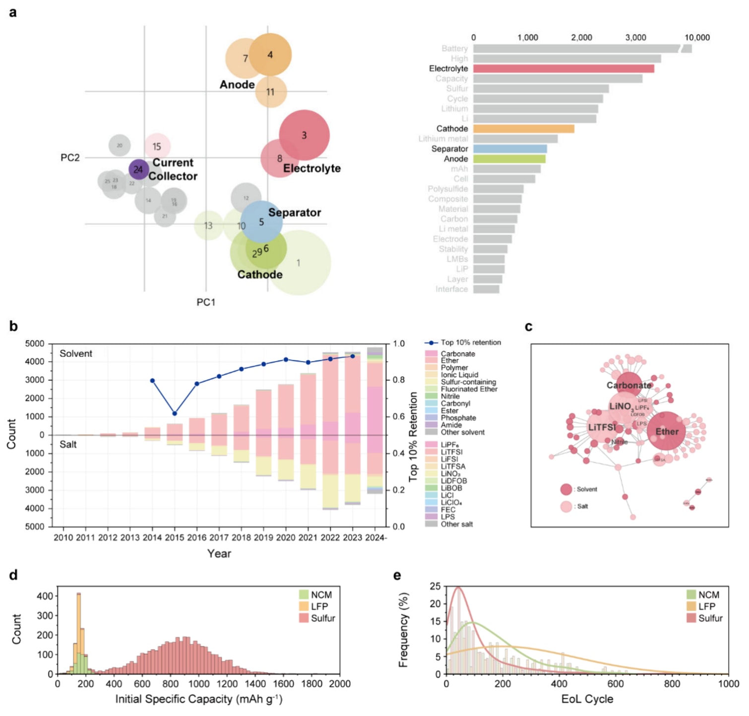 图3|锂金属电池的发展趋势与研究探索 a. 基于 LDA 分析得到的锂金属电池论文主题间距离图及其分布。 b. 对 3,606 篇论文中不同电解液溶剂和盐材料分布的堆叠直方图,折线表示不同年份容量保持率前 10%。 c. 溶剂与盐之间的力导向网络图,出现频率更高且常共同使用的分子显示得更大且彼此更接近。 d. 初始容量的直方图(8,687 个电池)以及 e. 合并数据库中的寿命终点(EOL)数据(1,736 个电池),其中 NCM、LFP 和硫正极电池分别以绿色、橙色和红色表示。