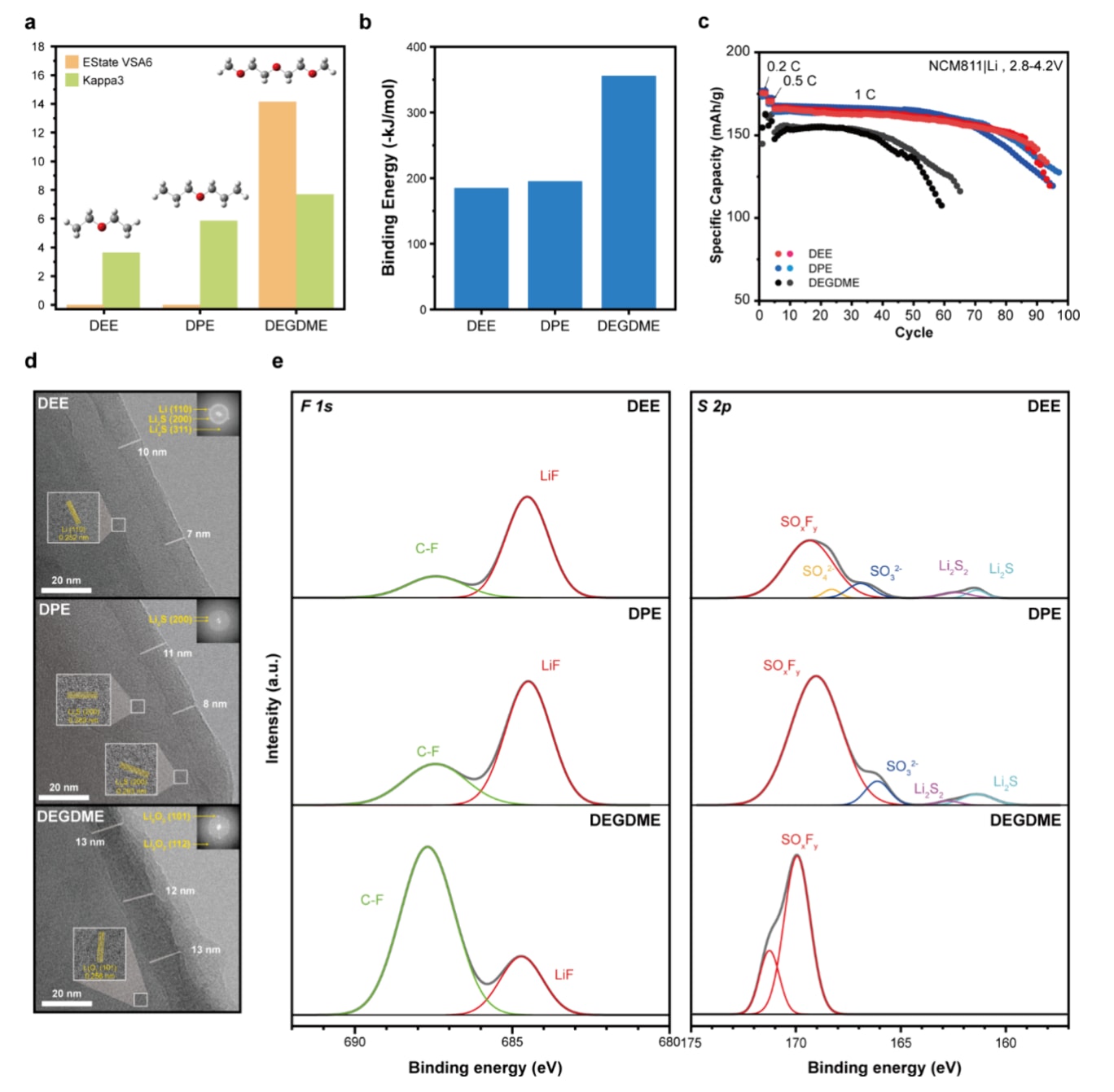 图6|溶剂化效应对循环性能与 SEI 形貌的影响 a. 溶剂的分子特征(EState VSA6 和 Kappa3)及其结构。 b. 溶剂的 Li⁺ 结合能。 c. 在 1C 倍率下,采用 2 M LiFSI DEE、2 M LiFSI DPE 和 2 M LiFSI DEGDME 电解液的 Li||NCM811 扣式电池循环性能(预先进行 0.2C 和 0.5C 的两个预循环)。 d. Li 金属沉积(1C)形成的 SEI 层的冷冻透射电子显微镜(cryo-TEM)图像,插图为对应的快速傅里叶变换(FFT)图像。 e. 在 DEE、DPE 和 DEGDME 电解液体系下循环后的电池 SEI 层中 F 1s 和 S 2p 信号的去卷积 XPS 光谱。