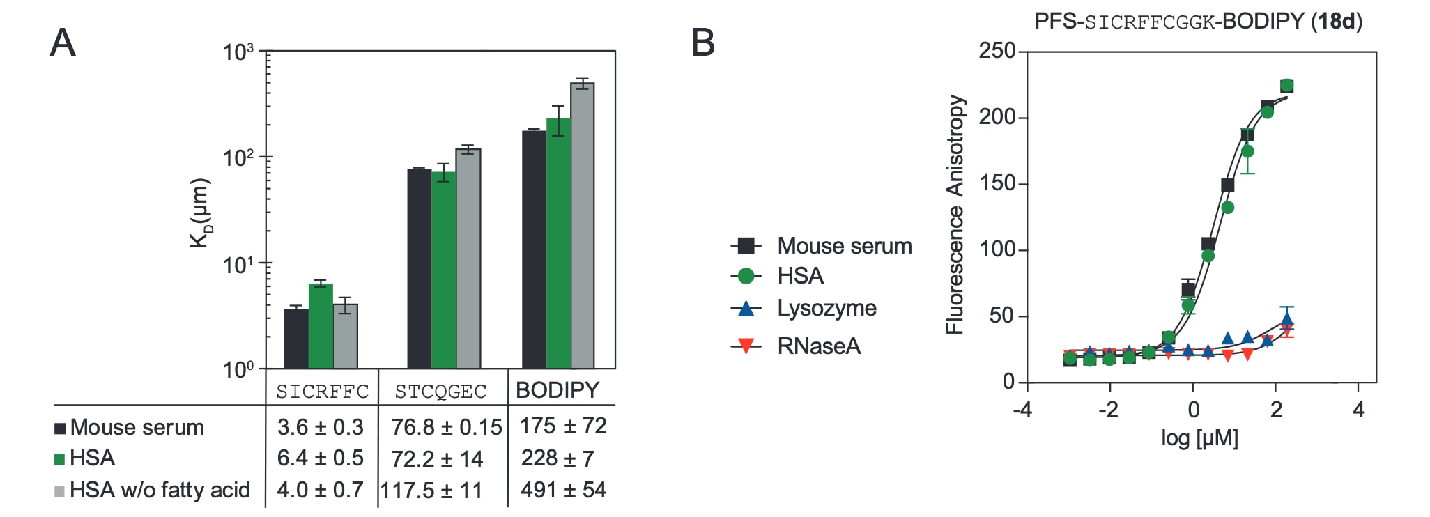 此外,引入BODIPY荧光基团后,通过荧光偏振(FP)实验进一步验证结合能力。以1 μM肽浓度进行白蛋白滴定,得到PFS-SICRFFCGGK的结合亲和力为