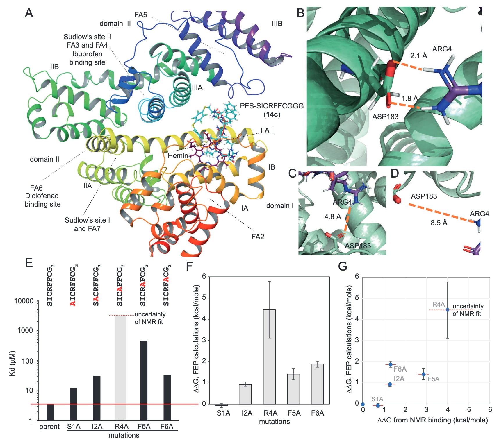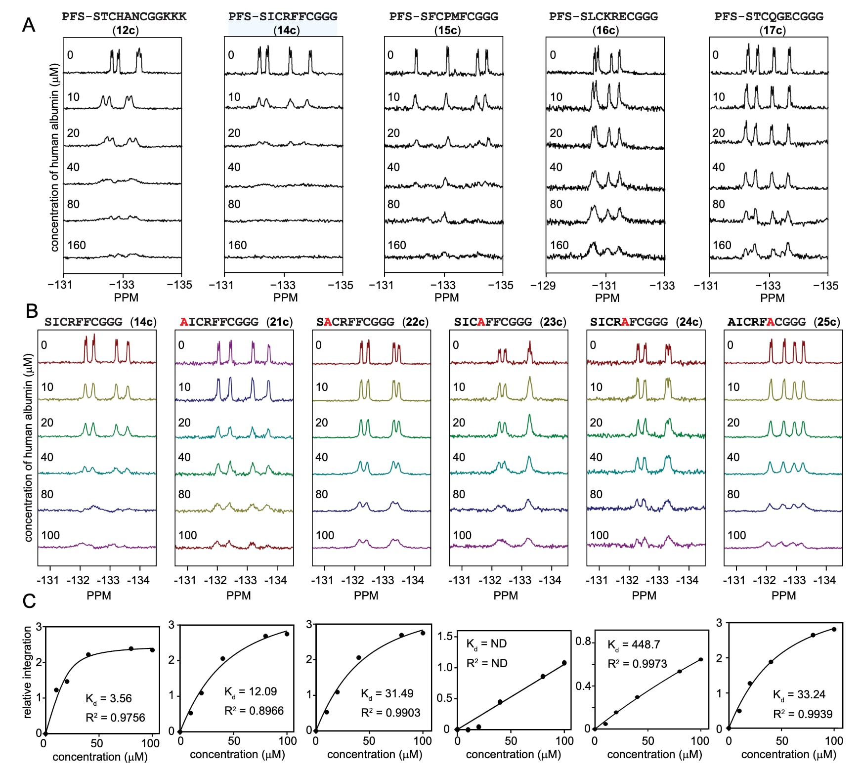 进一步分析发现,结合能力并非仅由全氟芳香连接基决定,肽序列本身起主导作用。对14c进行丙氨酸扫描显示,R4A或F5A突变会完全破坏与白蛋白的结合,而S1A和I2A突变则分别导致约3倍和10倍的亲和力下降,说明序列中多个残基对结合均有重要贡献。该分子对大鼠和人源白蛋白均表现出类似的结合行为。采用等温滴定量热法尝试测定结合常数时,由于存在多位点、多步骤结合现象,难以获得可靠的定量结果,这一现象与既往研究一致,因此