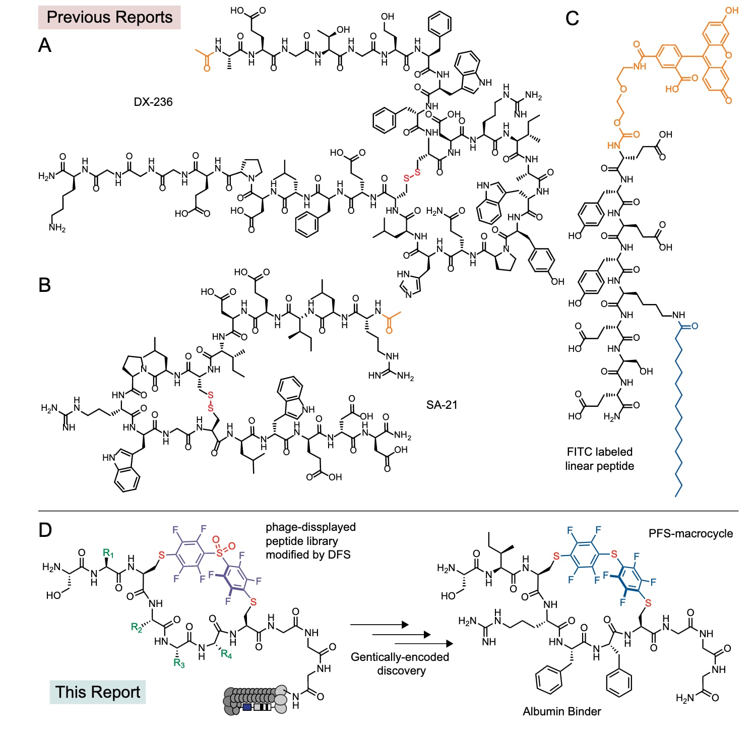 图1|白蛋白结合肽。 已有研究报道了多种白蛋白结合分子:A为大环肽DX-236,B为大环肽SA-21,C为线性肽FITC-EYEYKpalmESE-NH₂。D展示了该研究所采用的方法,即利用经化学修饰的噬菌体展示肽库,用于筛选小尺寸的白蛋白结合大环分子。