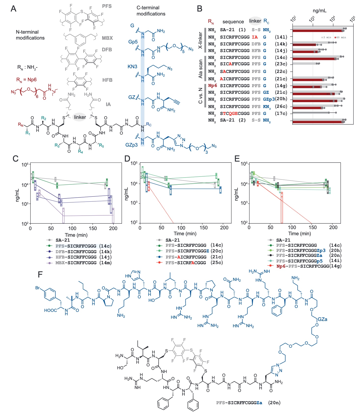 进一步比较不同连接基对体内表现的影响发现,将PFS替换为六氟苯(HFB)或十氟联苯(DFB)虽未完全丧失循环能力,但60分钟时的血浆浓度较14c降低约一个数量级。这些结果表明,14c的体内稳定性依赖于两个关键因素:特定的氨基酸序列以及由PFS连接基赋予的构象约束。