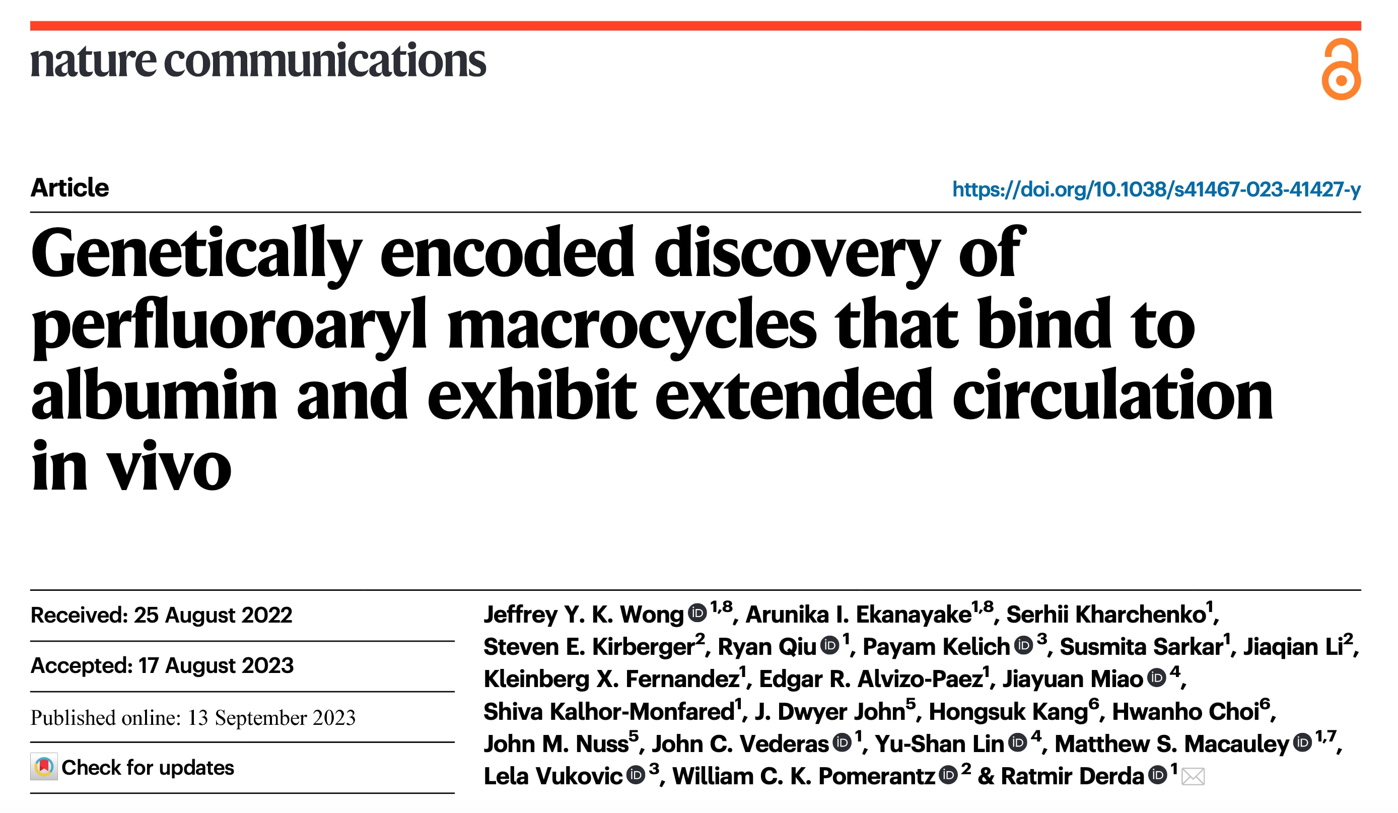 NC 2023 | 通过遗传编码方法发现可与白蛋白结合并在体内表现出延长循环时间的全氟芳基大环分子