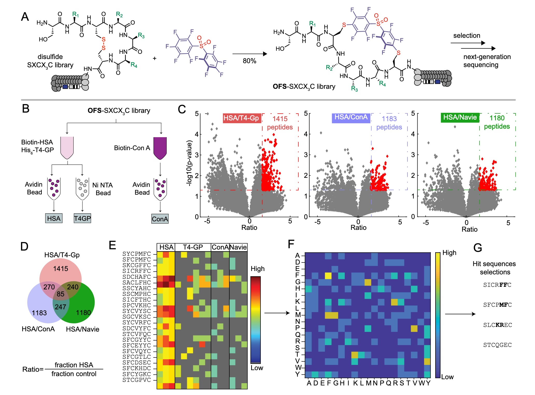图2|基于化学修饰噬菌体文库的筛选过程。 A展示了将噬菌体展示的SXCX₃C二硫键文库通过DFS修饰,转化为OFS-SXCX₃C大环文库的过程。B描述了筛选策略:在含有未标记乳蛋白的溶液体系中,将OFS-SXCX₃C文库与生物素化人血清白蛋白(HSA)以及带His标签的T4-GP蛋白共同孵育,随后分别通过亲和素磁珠和Ni-NTA磁珠对不同靶标进行捕获;负对照实验中,则以生物素化ConA替代HSA进行筛选并通过亲和素磁珠捕获。C为火山图,D为Venn图,用于展示在HSA筛选中相较于初始文库或针对T4-GP、ConA筛选显著富集的序列。E为差异富集分析中85条候选序列中排名前25的热图展示。F对所有85条候选序列进行了二肽基序分析。G展示了用于后续化学合成及功能验证所选取的代表性序列。