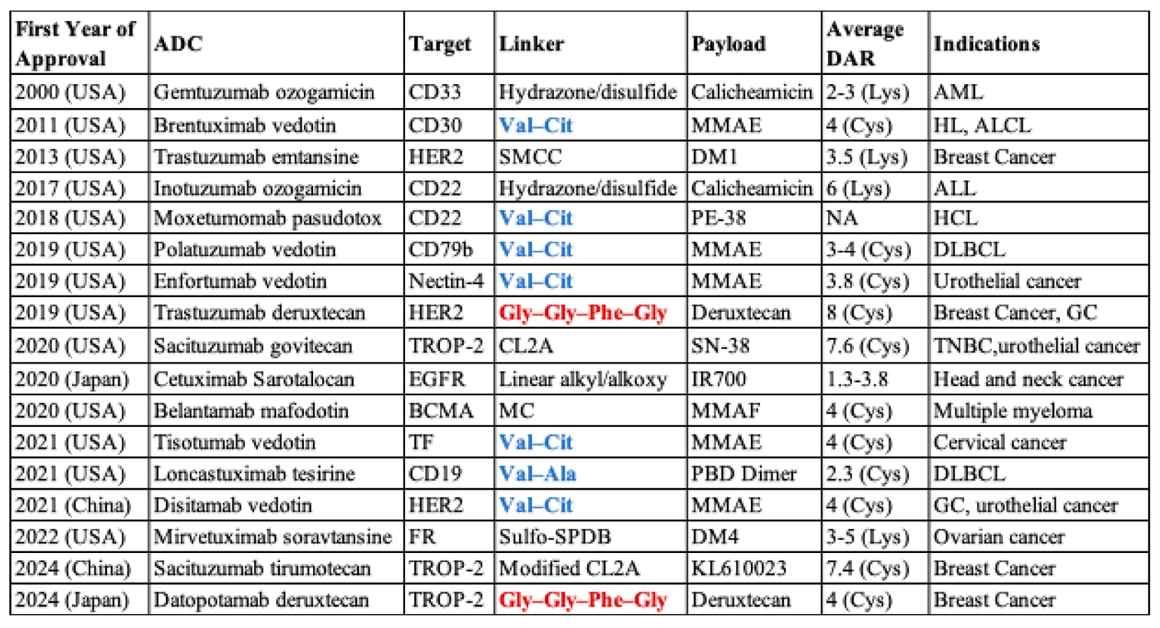 目前,已有17种ADCs获得批准并在全球上市(Table 1),超过100种在临床试验阶段,涵盖20余种血液恶性肿瘤与实体瘤适应症。血液肿瘤靶点包括CD19、CD22、CD30、CD33、CD79b以及B细胞成熟抗原;实体瘤靶点则涉及HER2、nectin-4、肿瘤相关钙信号转导蛋白2、组织因子(TF)与叶酸受体等。ADCs常用载荷包括微管结合剂(如MMAE、DM1、DM4)、DNA靶向药物(如calicheamicin)以及拓扑异构酶抑制剂(如SN-38)。多数获批ADCs采用可切割型连接子,如腙键、二硫键或肽连接子。在17种已批准ADCs中,有9种使用肽连接子,其中包括7种二肽连接子(Val−Cit或Val−Ala)与2种四肽连接子(Table 1)。