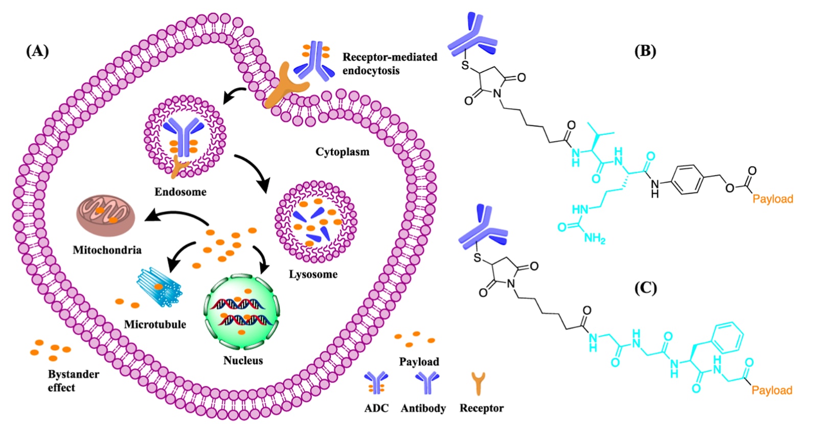 图2 (A) 传统ADC作用机制:ADC的抗体与癌细胞表面受体结合,形成ADC−抗原复合物,并通过受体介导的内吞作用进入细胞。随后,ADC从内体转运至溶酶体,在此降解释放载荷至细胞质中。游离载荷通过与微管、线粒体或细胞核内DNA相互作用来杀伤肿瘤细胞。一部分载荷还可扩散至邻近肿瘤细胞,产生旁观者效应。(B) Val−Cit二肽连接子的化学结构。(C) Gly−Gly−Phe−Gly四肽连接子的化学结构,均以青色标注。