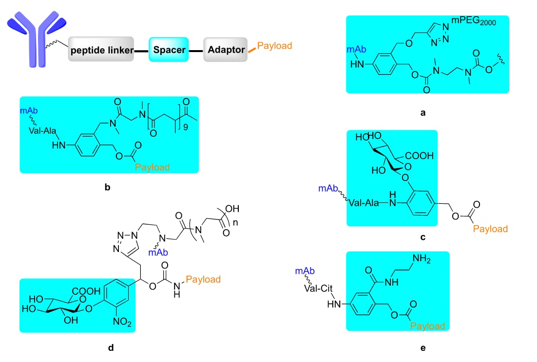 图4 | 代表性ADC连接子的化学结构 ,含有亲水性基团的修饰:PEG(a−c)、环糊精(d)与pSAR(e),青色背景部分为高亮。