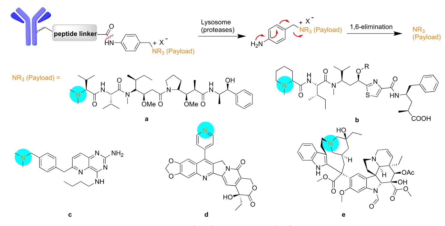 图7 | ADC连接子中季铵盐(QAS)的化学结构(a−e)。 如图上方所示,酶切断酰胺后,p-氨基苄基QAS自裂解,最终无痕释放出叔胺或杂芳胺与载荷。叔胺以青色标注。