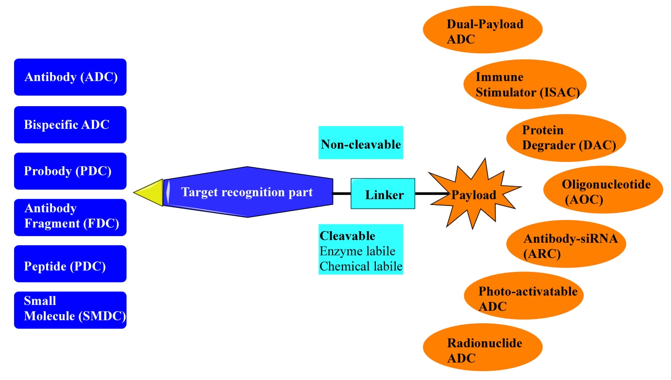 图1 | 基于新型靶点识别或载荷设计的药物偶联物组成与分类。 每一部分——靶点识别单元、连接子和载荷——都在决定药物偶联物性质中发挥关键作用。