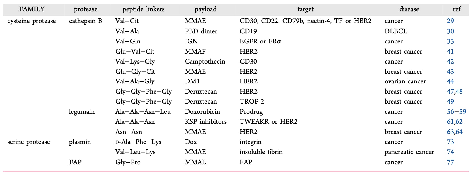 目前多数已上市ADC采用cathepsin可切割肽连接子。然而,研究发现这些连接子也可能被外源酶(如Ces1C和中性粒细胞弹性蛋白酶)切割,从而导致脱靶毒性。人类基因组中已鉴定出600余种蛋白酶,其中许多与肿瘤增殖、侵袭和转移密切相关。因此,研究者开发了基于**其他酶类(如legumain、纤溶酶PLM和成纤维细胞活化蛋白FAP)**的肽连接子,以减少非特异性药物释放(Table 2)。