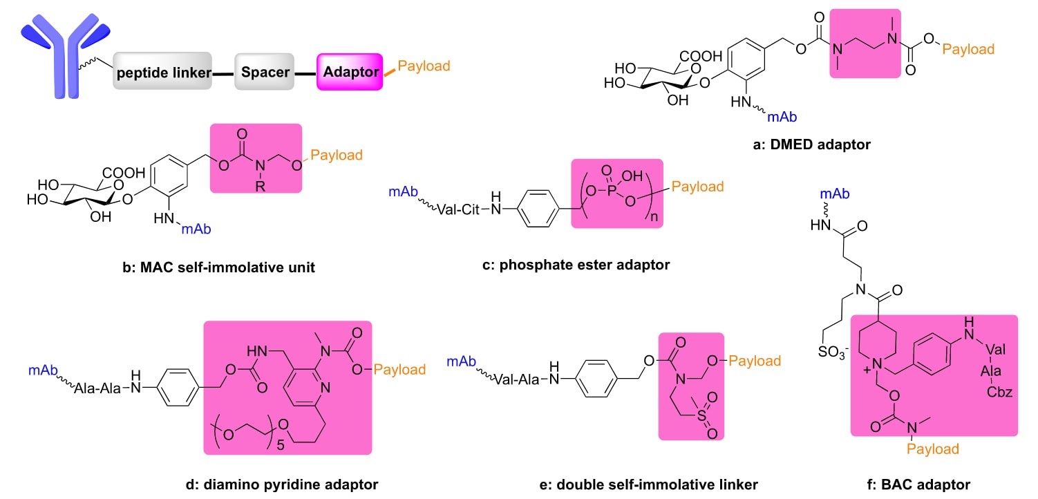 图6 | ADC连接子中PABC修饰的化学结构(a−e)。 苯环上的自裂解型PABC修饰以青色标注。