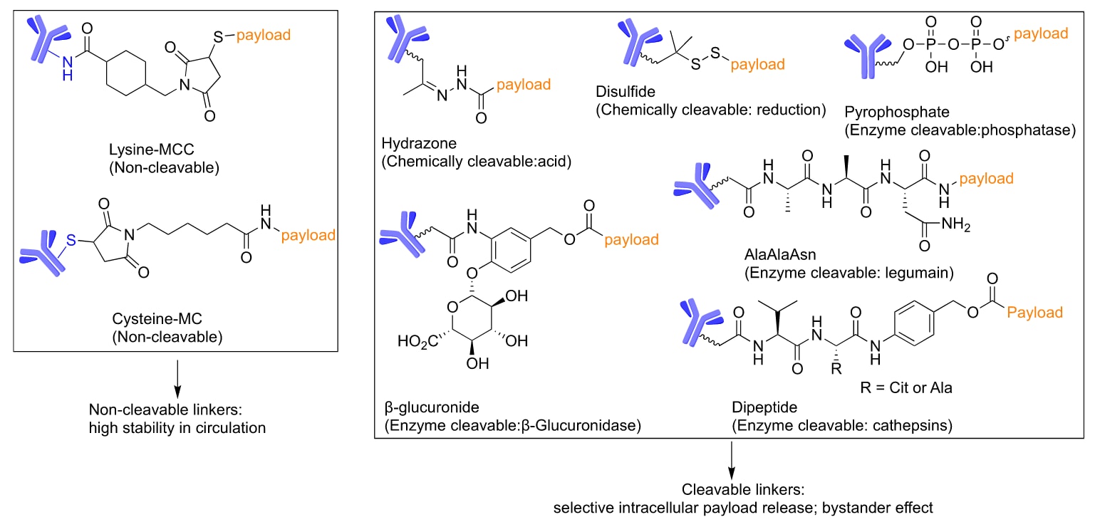 图3 | ADC连接子的化学结构与特征。 不可切割连接子主要包括MCC(马来酰亚甲基环己烷-1-羧酸酯)和MC(马来酰己酰)硫醚连接子。可切割连接子则可被酸性环境(如内体与溶酶体)、还原性分子(如谷胱甘肽)或酶切割。