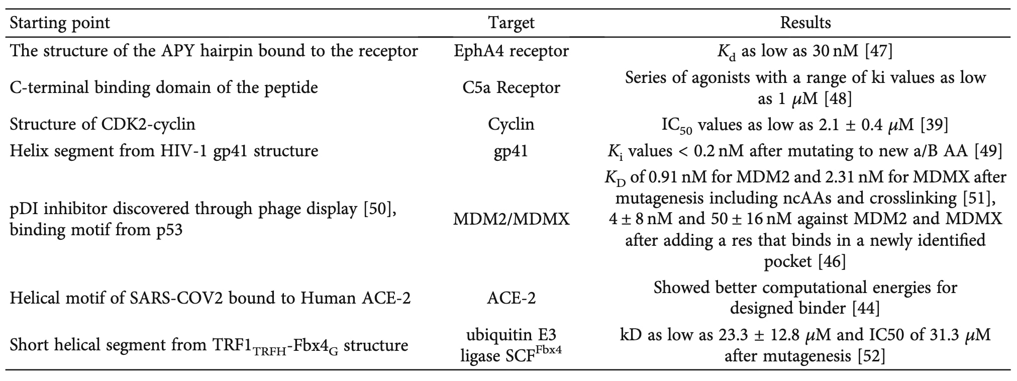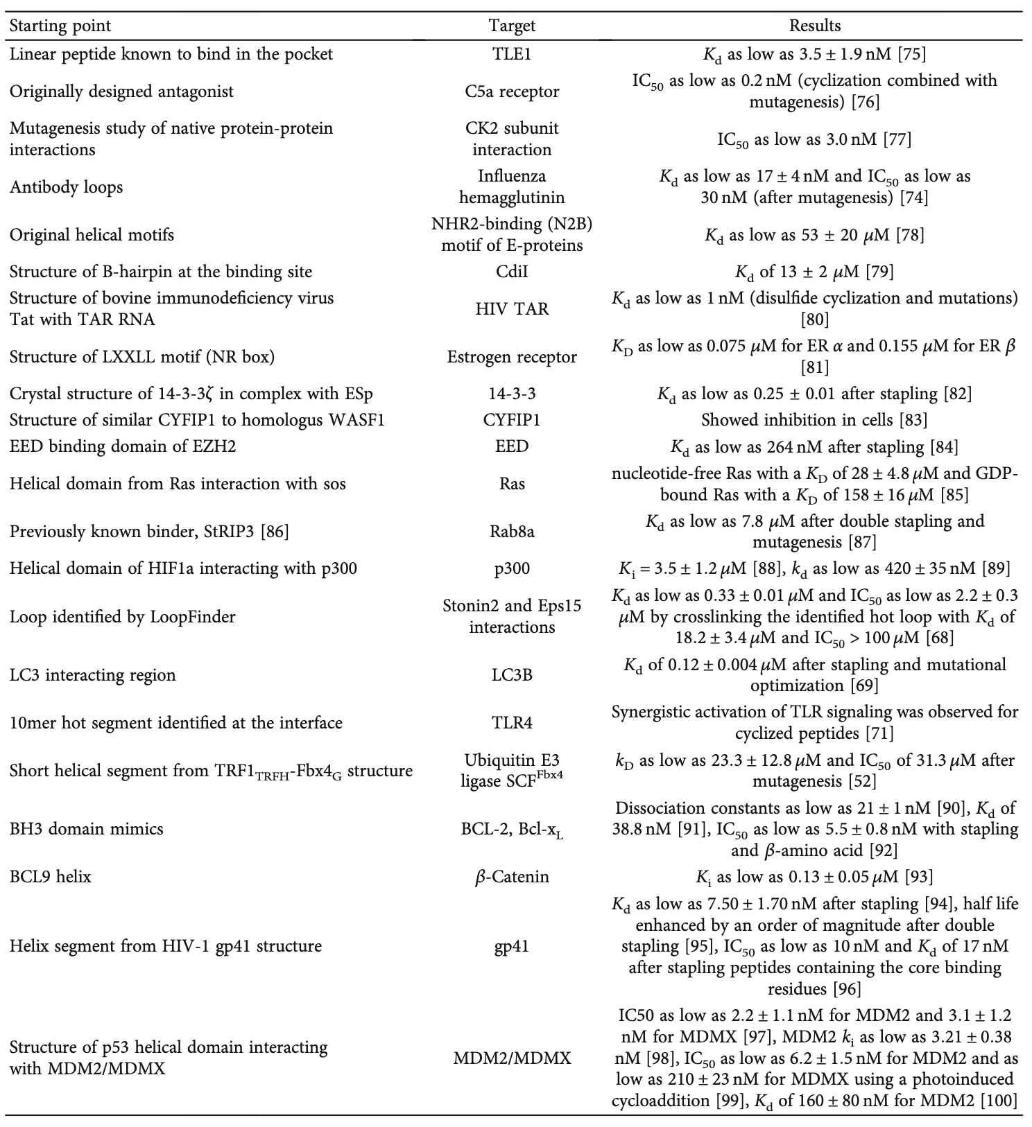 天然的蛋白–蛋白相互作用是在进化过程中形成以执行特定功能的,但这种功能并不总是与高结合亲和力直接相关。事实上,在许多生物过程中,低亲和力或瞬时结合事件反而是必要的。因此,通过在结合界面处对肽序列进行突变,可以增强已知肽–蛋白相互作用的结合强度(见表2)。