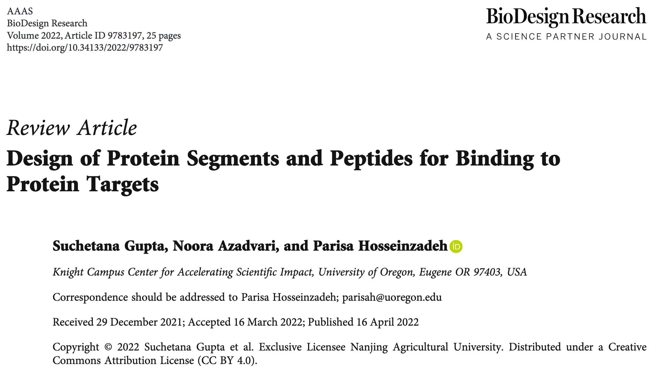 Gupta, S.; Azadvari, N.; Hosseinzadeh, P. Design of Protein Segments and Peptides for Binding to Protein Targets. BioDesign Research 2022. https://doi.org/10.34133/2022/9783197.
