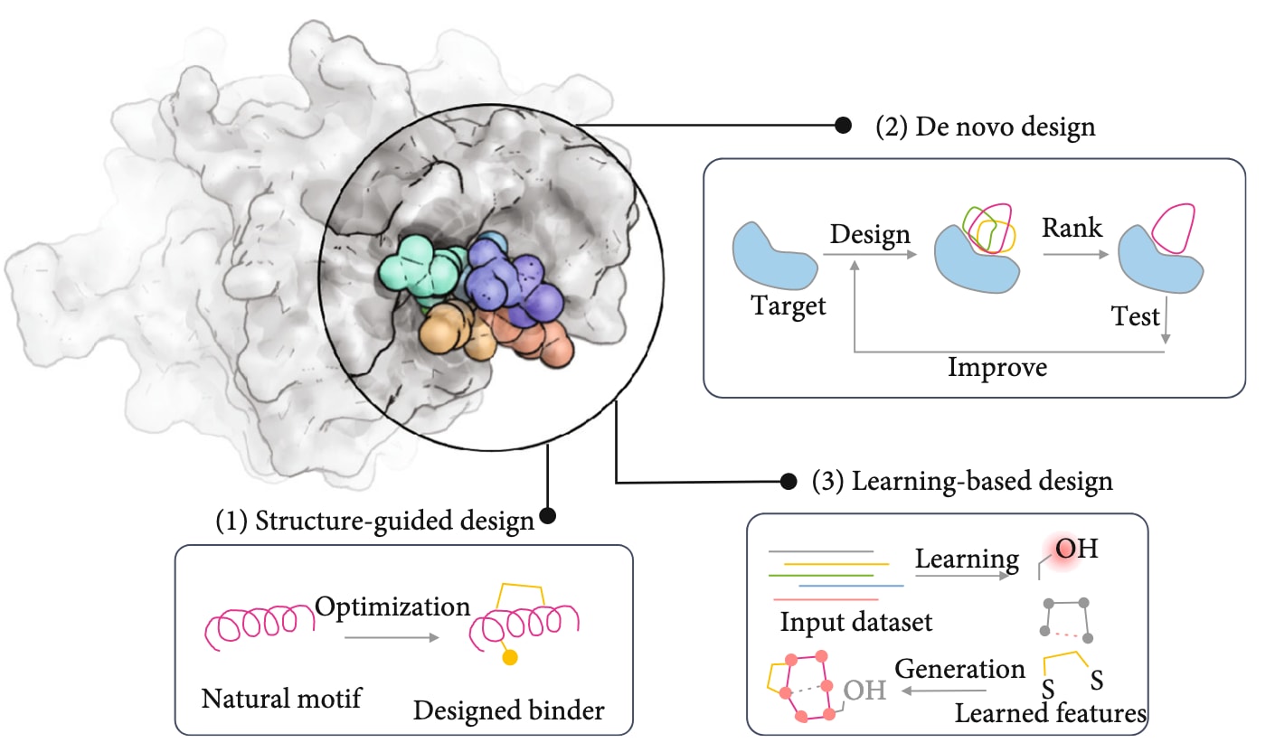 图2 | 用于设计肽类结合物的不同方法示意图。 为了获得能够结合目标表面的肽分子(图左上圆圈中球体所示,结构来自PDB编号:6WSJ),研究者通常采用三种主要策略:(1) 结构引导型设计,以天然存在的结构基序为起点构建结合肽;(2) 从头设计(de novo design),通过完全从零生成大量潜在肽分子并进行评分筛选,以确定最优候选;(3) 基于学习的设计方法,利用机器学习与深度学习技术,从现有实验与结构数据中学习规律,预测并生成高亲和力的肽结合物。