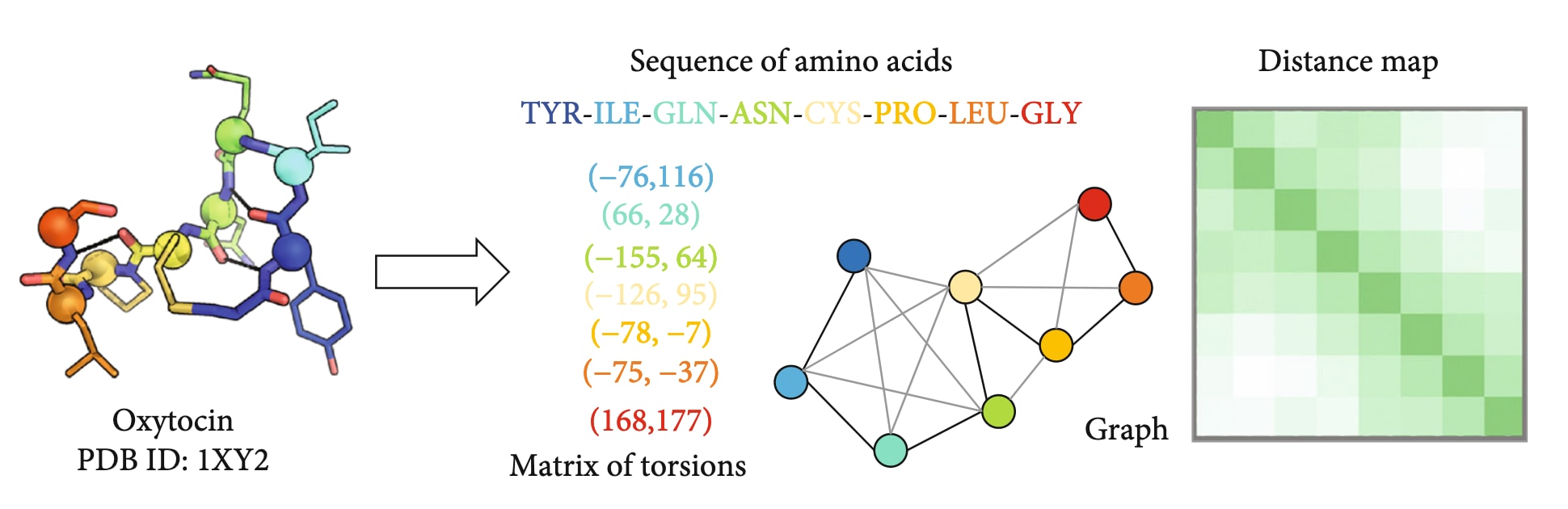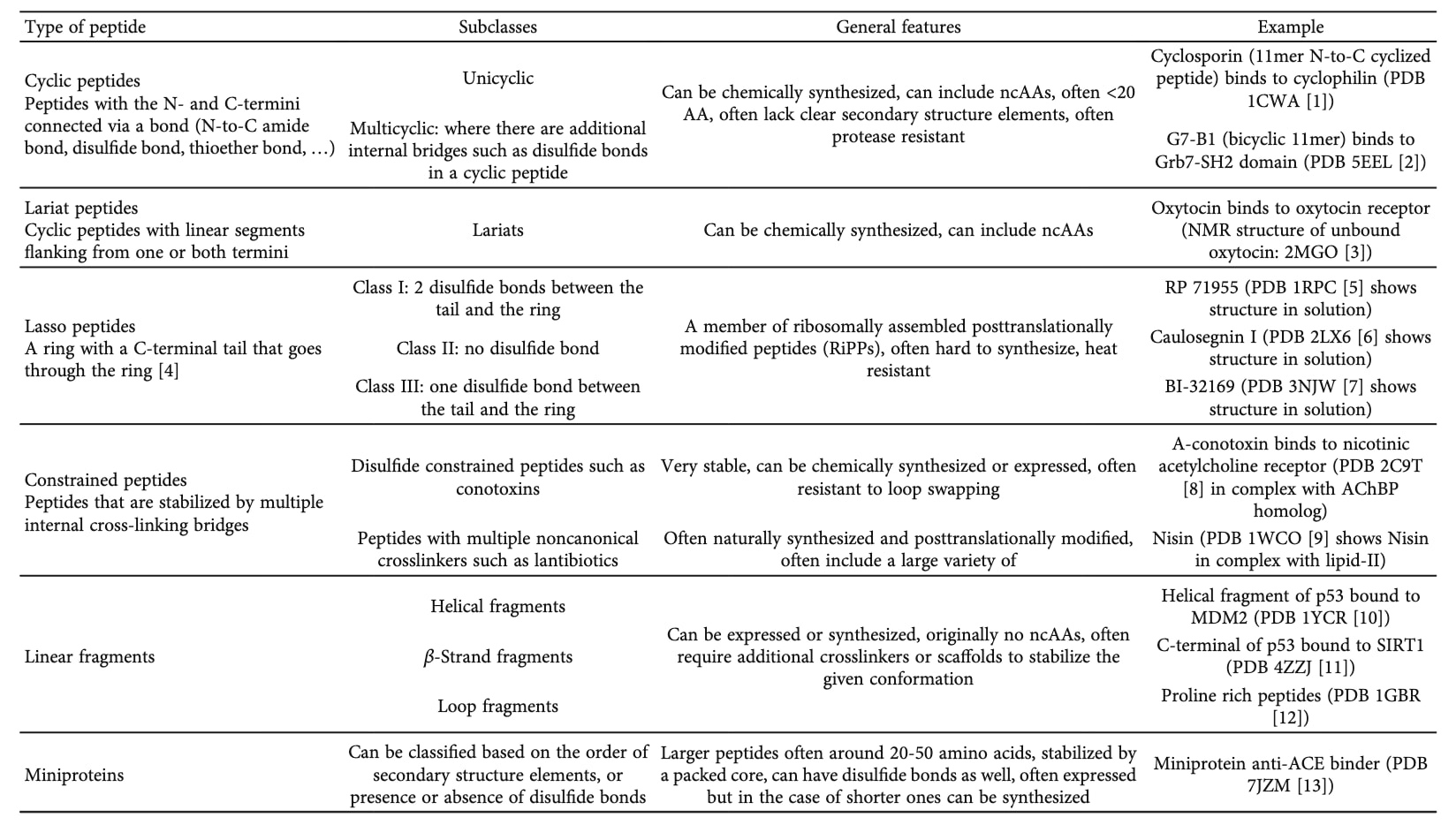 表1 | 不同类型肽的分类说明、特征及其结构实例。 总结了多类肽的基本信息,包括其功能描述、主要结构特征以及具有代表性的结构实例,以展示肽分子在生物功能与构象多样性方面的广泛差异。