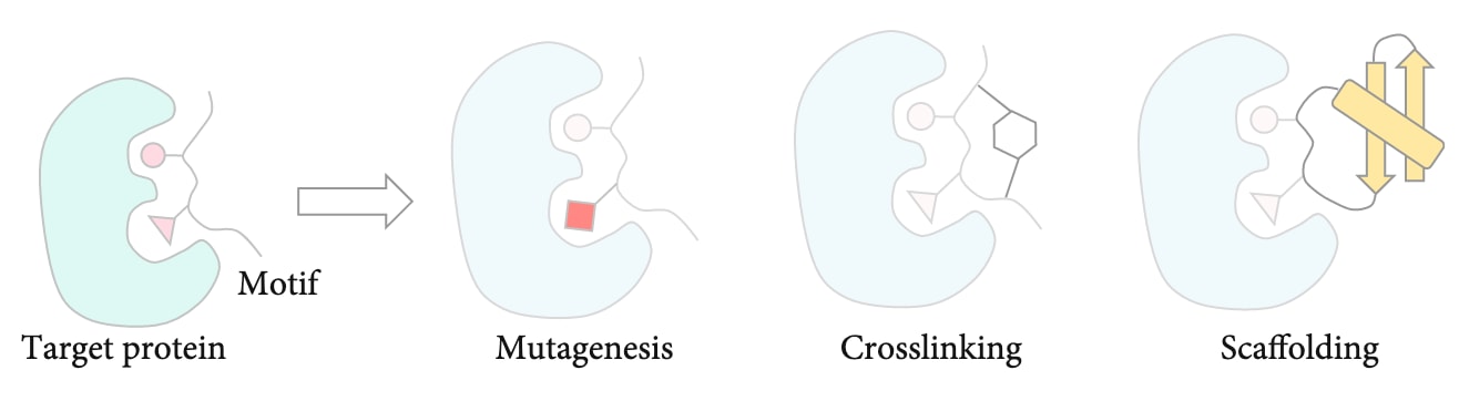 图3 | 结构引导型设计方法以天然存在的结构基序为起点。 该基序随后可通过突变(mutagenesis)、交联(crosslinking)或支架化(scaffolding)等方式进行稳定化与功能优化。通常需要多种策略的结合才能获得具有理想亲和力的肽分子。值得注意的是,在某些情况下,**从头设计(de novo design)**的肽也可在现有基序的基础上构建,并结合上述方法进行改进(详见第3节)。