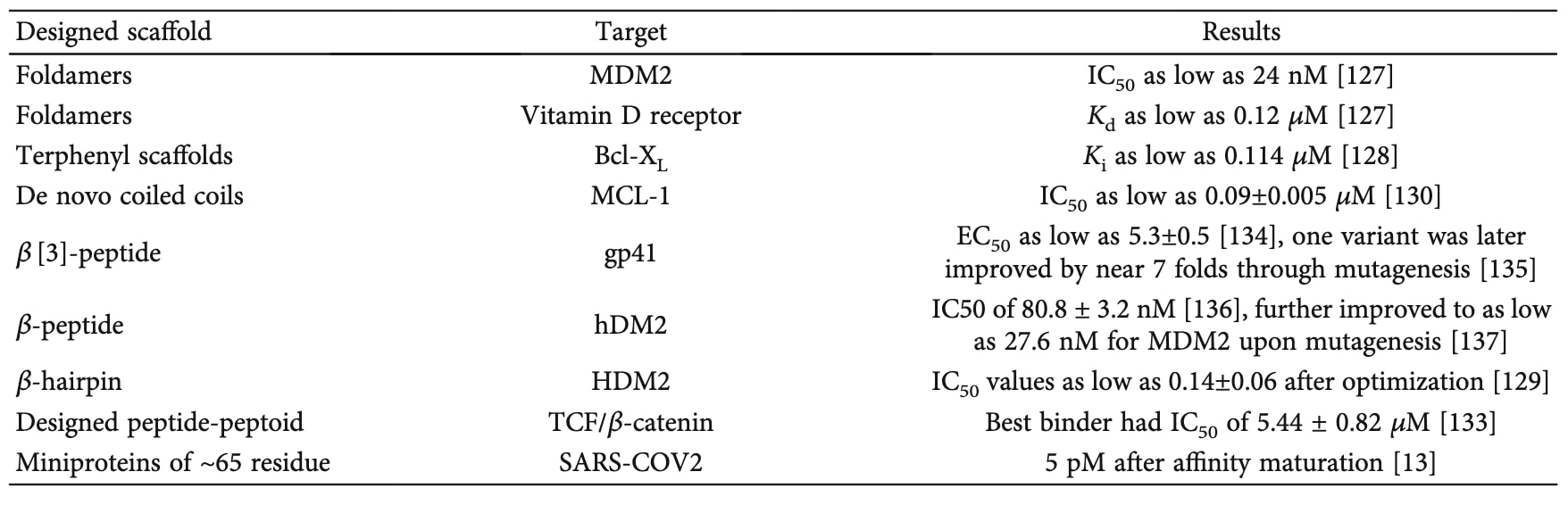 表5 | 用于结合蛋白靶标的从头设计支架实例。 该表汇集了多种从头构建的肽或蛋白支架(de novo designed scaffolds)在靶蛋白结合中的应用实例,涵盖螺旋、β-折叠及混合折叠结构等类型。这些支架通常通过热点残基的空间定向呈现或骨架刚性优化实现高亲和结合,展示了结构驱动型设计在功能性肽开发中的潜力。
