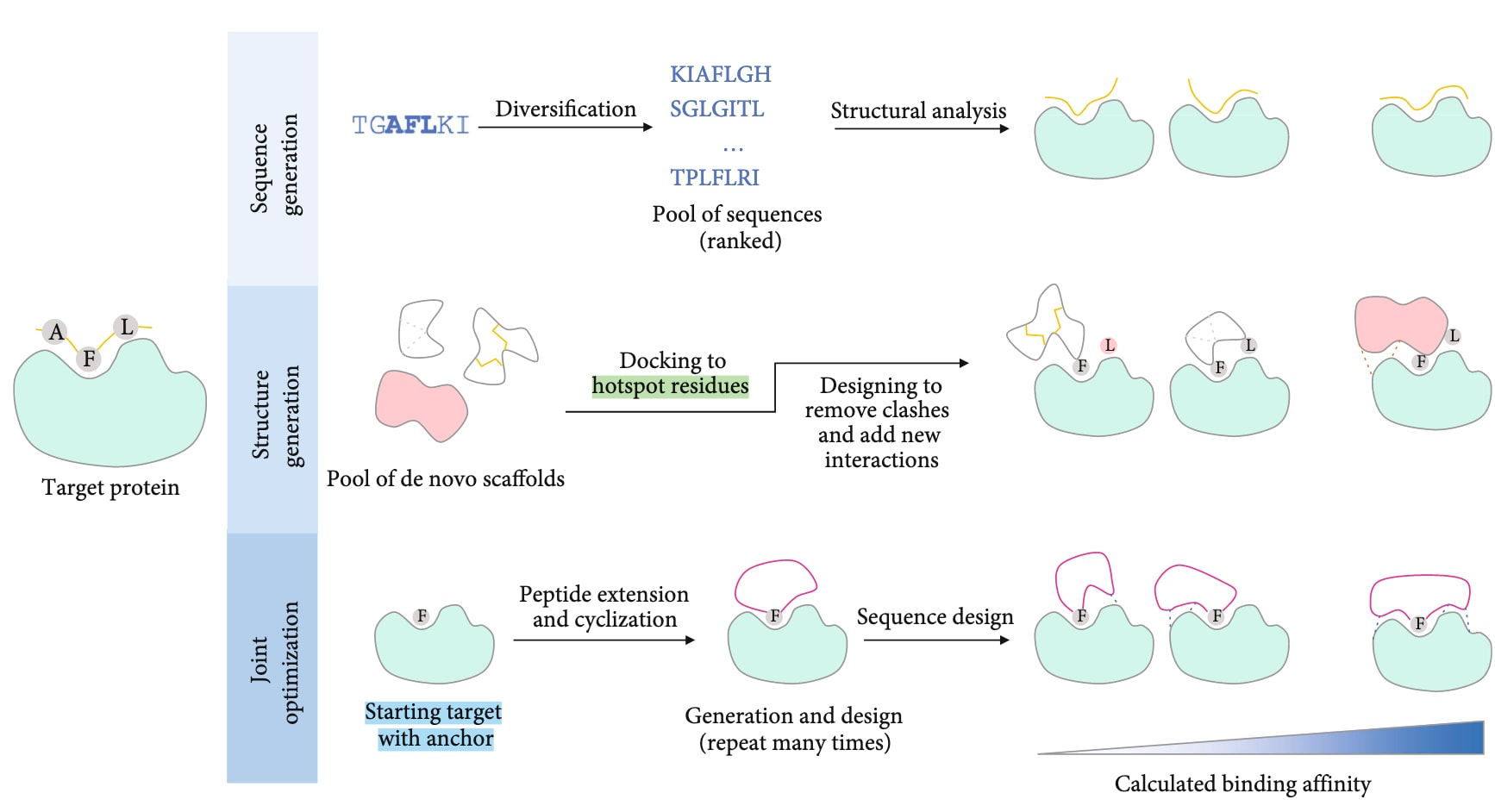 图4 | 从头设计生成肽结合物的方法概览。 从头设计肽结合物可大体分为三类策略:(a) 从头生成序列:先产生多样化的序列库,再基于序列评分及下游结构分析的结合能计算筛选出最优结合肽;(b) 从头生成结构:首先构建具有特定构象的结构支架(scaffold),用于在界面上呈现并稳定一组关键热点残基(hotspot residues);(c) 序列与结构联合优化:在同一步骤中同时生成序列与结构。该方法通常以界面处的**锚点(anchor)**功能基团为起点,在靶蛋白口袋环境中生成肽结构,优化序列并根据序列调整构象,以获得最佳结合体。多轮循环后可形成一组高潜力结合肽候选。