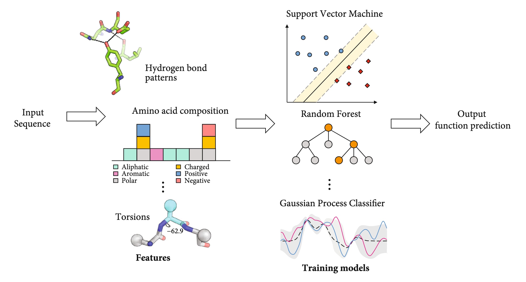 综上,机器学习正在从功能预测逐步走向功能生成,通过结合结构建模、理化特征与神经网络表达,为功能性肽的可解释性设计与高通量筛选提供了强大支持。
