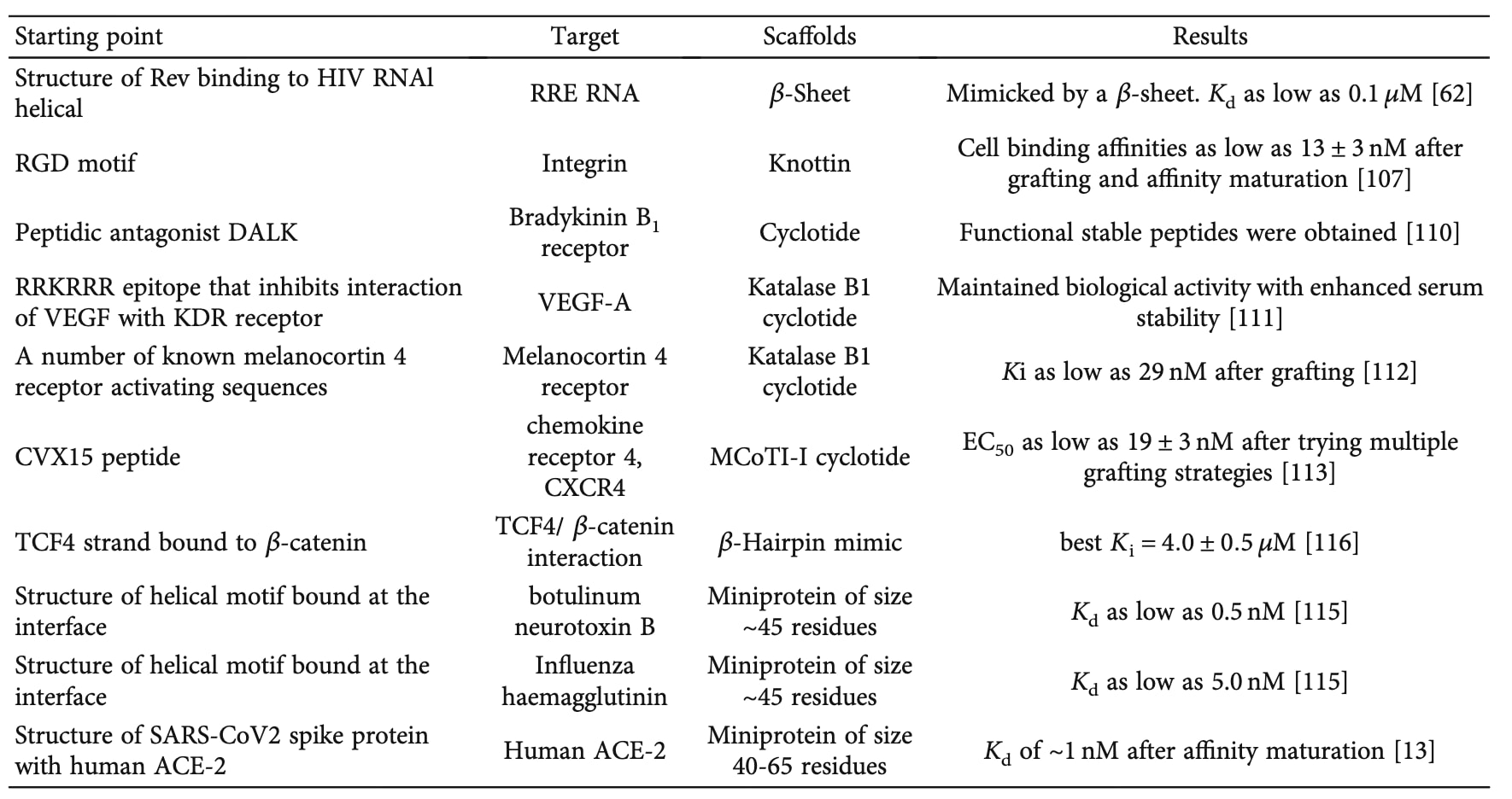 表4 | 不同结构基序嫁接至现有支架的实例。 汇总了将多种天然或人工结构基序(motifs)嵌入稳定肽或蛋白支架(scaffolds)的代表性研究,展示了通过环肽、结蛋白、迷你蛋白等刚性框架嫁接螺旋、β折叠或环状结构以提升肽分子的稳定性、亲和力与特异性的典型应用。