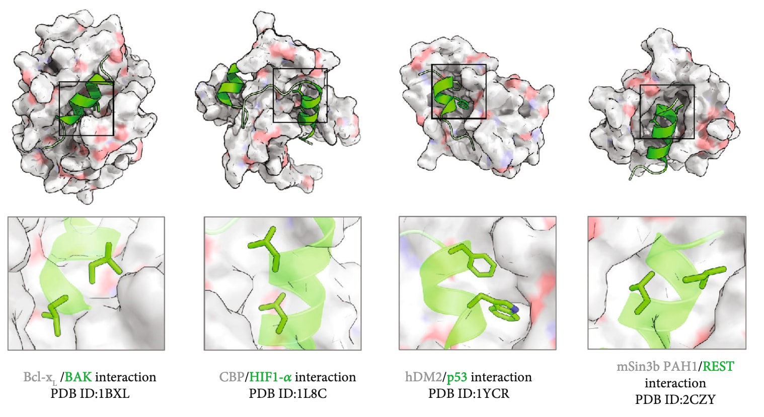图7 | 螺旋基序在蛋白–蛋白界面中普遍存在。 图中展示了多种由α螺旋介导的蛋白–蛋白相互作用实例。棒状结构表示在结合中起关键作用的热点残基(hotspot residues);下方各框为上方总体结构中热点区域的放大视图。底部面板中螺旋以半透明示意方式呈现,以便清晰显示界面中热点残基的空间分布。