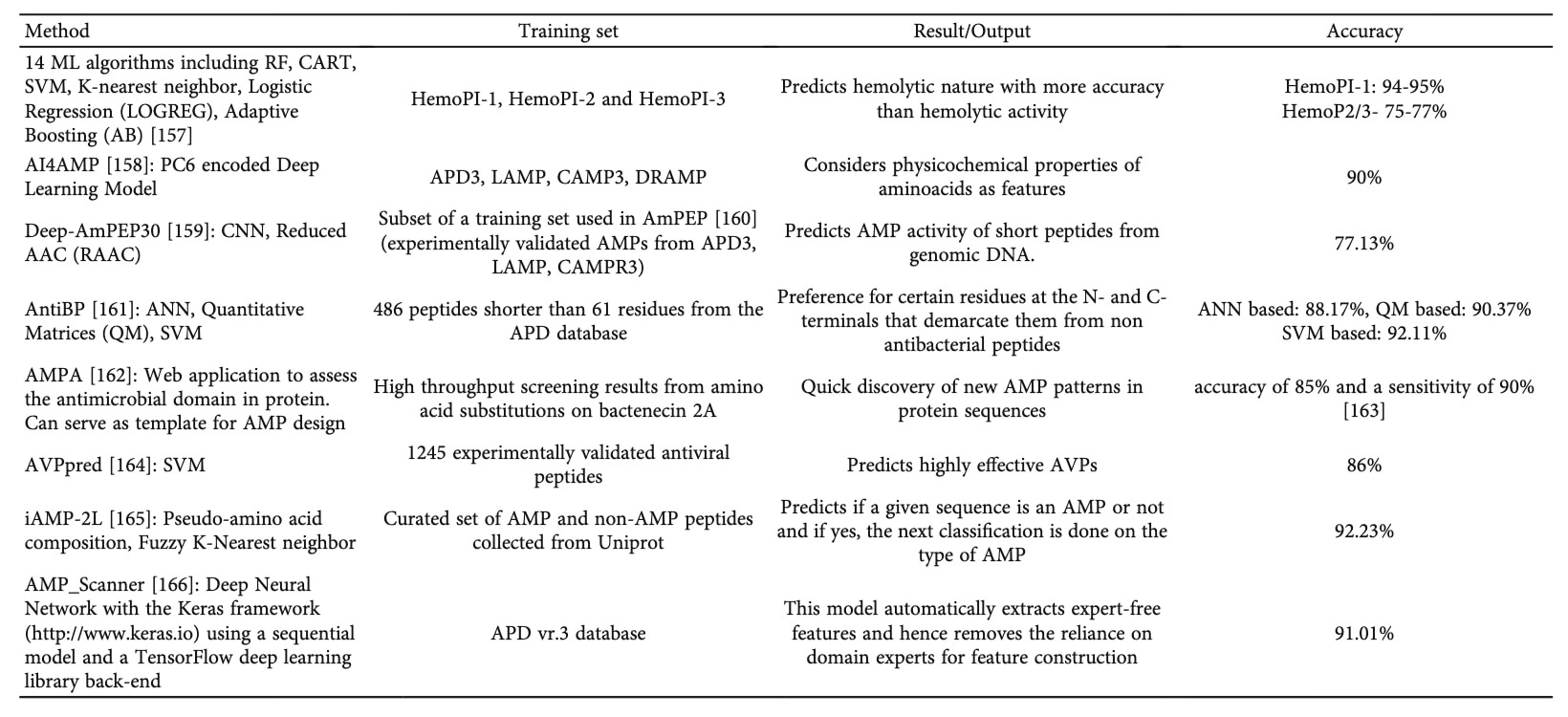 表7 | 抗菌肽(AMP)活性预测方法概览。 该表总结了多种用于预测AMP活性的计算方法,包括传统机器学习模型与深度学习模型,并列出其主要算法类型、输入特征(如氨基酸组成、理化性质或序列编码方式)及预测性能指标。需强调,表中列出的准确率基于不同基准数据集,因此结果之间不可直接比较。