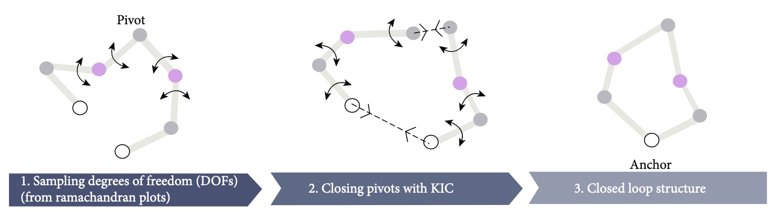 图8 | 利用广义运动链闭合算法(GenKIC)采样环状肽的示意图。 该方法的第一步是随机采样除三个“枢轴点”(pivot residues)外所有残基的扭转自由度;第二步则计算这三个枢轴残基的二面角,以确保形成闭合环结构。整个过程中,**锚点(anchor)**的位置保持不变,从而在约束条件下生成符合空间闭合要求的环肽构象。