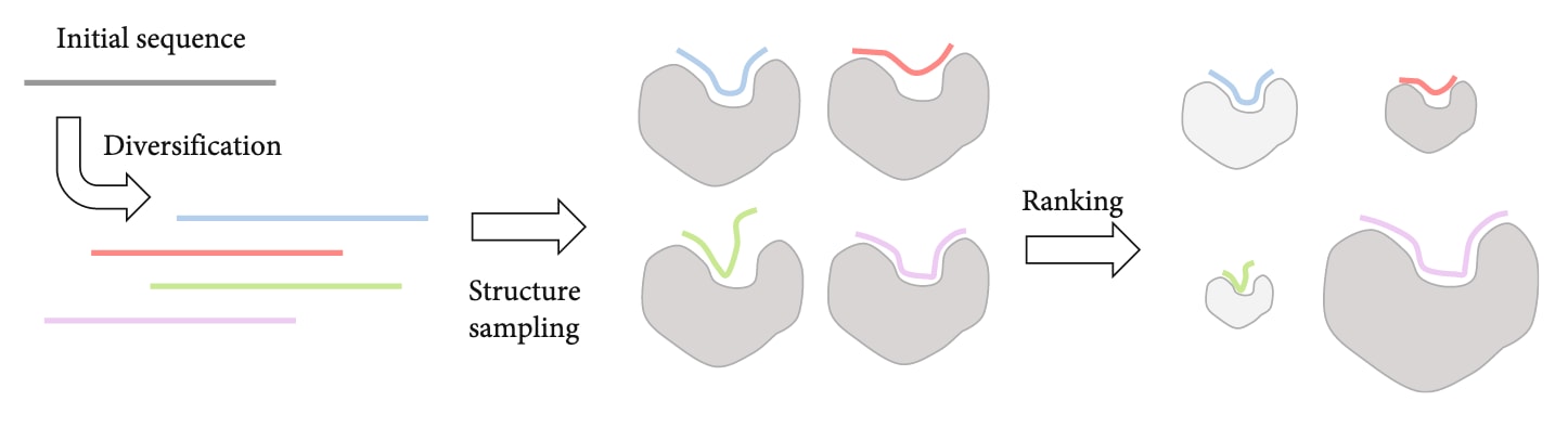图5 | 基于序列采样的从头设计方法总体示意图。 该设计流程首先经过序列多样化步骤,生成一组候选肽序列;随后进行结构建模与打分,根据模型质量对序列进行排序。右侧示意中,圆形大小与序列排名成正比(越大代表模型评分越高)。最终,得分最高的序列将被用于实验验证,或作为下一轮设计与优化的起始序列输入。