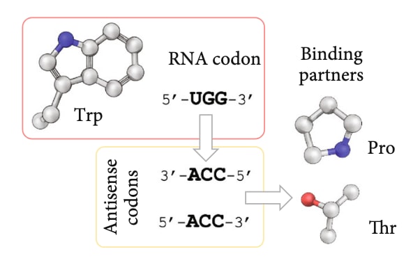 图6 | 正反义氨基酸配对理论示意图。 该理论的核心假设是:在为肽设计选择与靶标表面结合的氨基酸时,与界面上氨基酸呈反义(antisense)关系的残基,其结合亲和力通常高于随机选择的氨基酸。两种氨基酸是否构成正义(sense)与反义(antisense)配对,是根据其tRNA密码子之间的互补关系来确定的,如图所示。