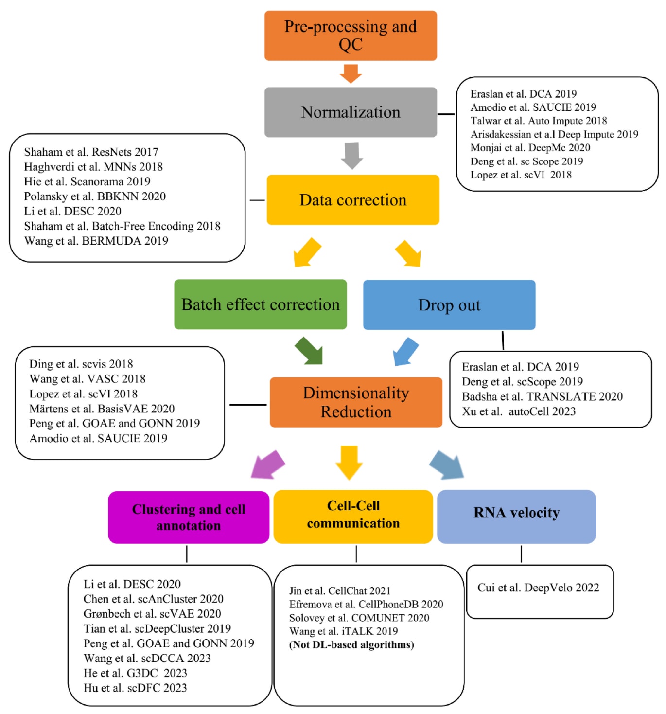 深度学习算法因具备多任务处理与可扩展性,被视为构建端到端单细胞分析流程的关键工具。与传统依次执行不同任务的分步框架不同,深度学习模型可同时执行质量控制、数据校正与下游分析,并使各任务相互促进。此类模型有望超越传统分析流程。尽管目前端到端的深度学习模型仍处于早期阶段,一些初步研究(如scVI框架)已显示出显著潜力,证明深度学习在单细胞数据分析管线的构建中具有广阔前景。鉴于当前有关预处理与质量控制的研究相对有限,以下重点讨论深度学习在归一化、数据校正及下游分析中的应用。
