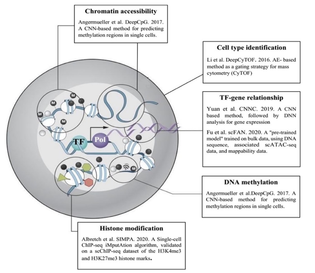 深度学习在该领域的应用迅速增长,凭借其可扩展性与自动特征提取能力,成为解析单细胞基因组与表观基因组的重要工具。应用包括细胞类型识别、DNA甲基化模式分析、染色质可及性预测、转录因子–基因调控关系建模及组蛋白修饰识别等。相关数据可从公共数据库如NCBI、Ensembl及DDBJ下载。后续章节将重点介绍深度学习在单细胞DNA测序数据分析中的具体应用(见图4)。