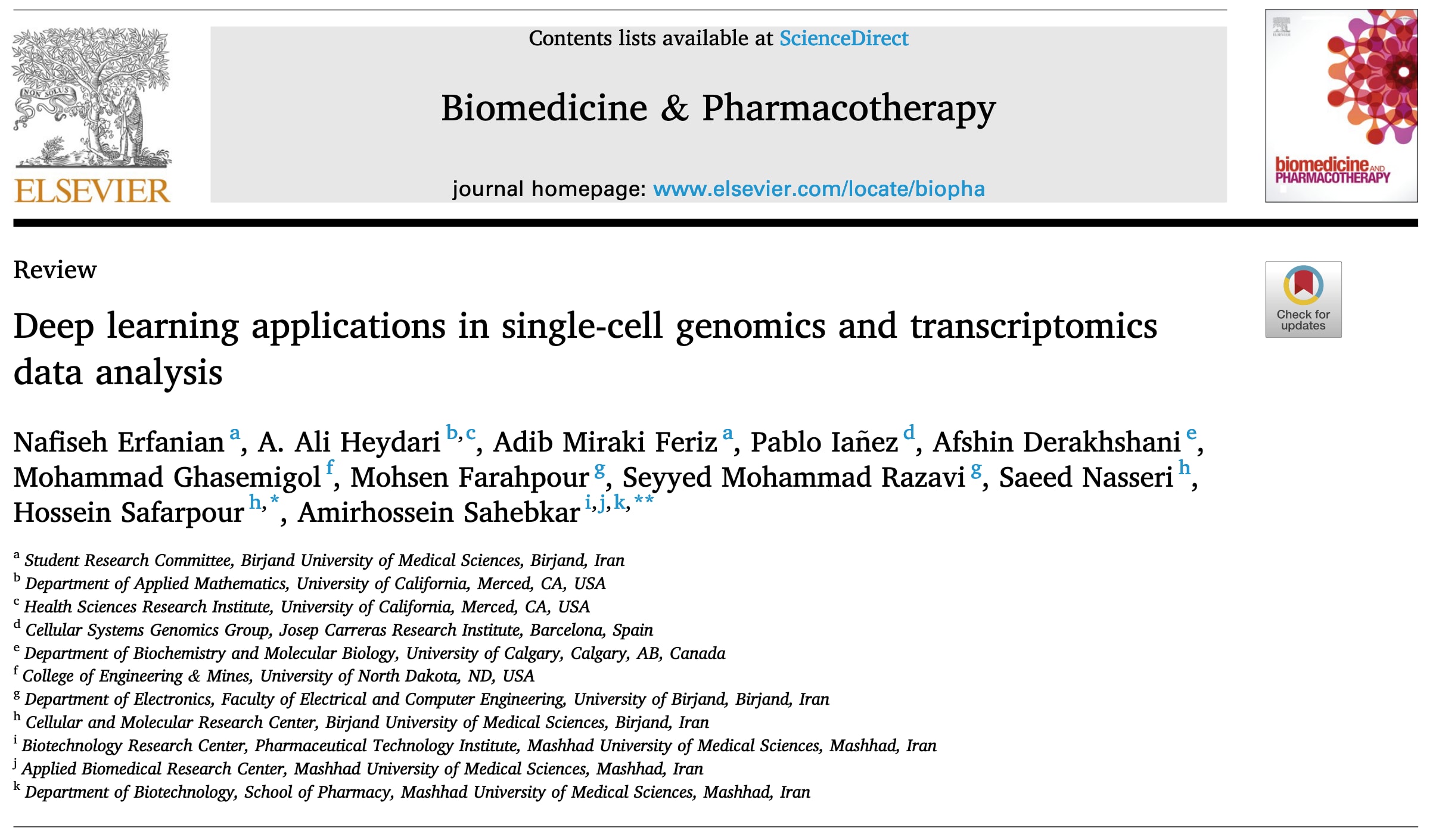 Erfanian, N.; Heydari, A. A.; Feriz, A. M.; Iañez, P.; Derakhshani, A.; Ghasemigol, M.; Farahpour, M.; Razavi, S. M.; Nasseri, S.; Safarpour, H.; Sahebkar, A. Deep Learning Applications in Single-Cell Genomics and Transcriptomics Data Analysis. Biomedicine & Pharmacotherapy 2023, 165, 115077. https://doi.org/10.1016/j.biopha.2023.115077.
