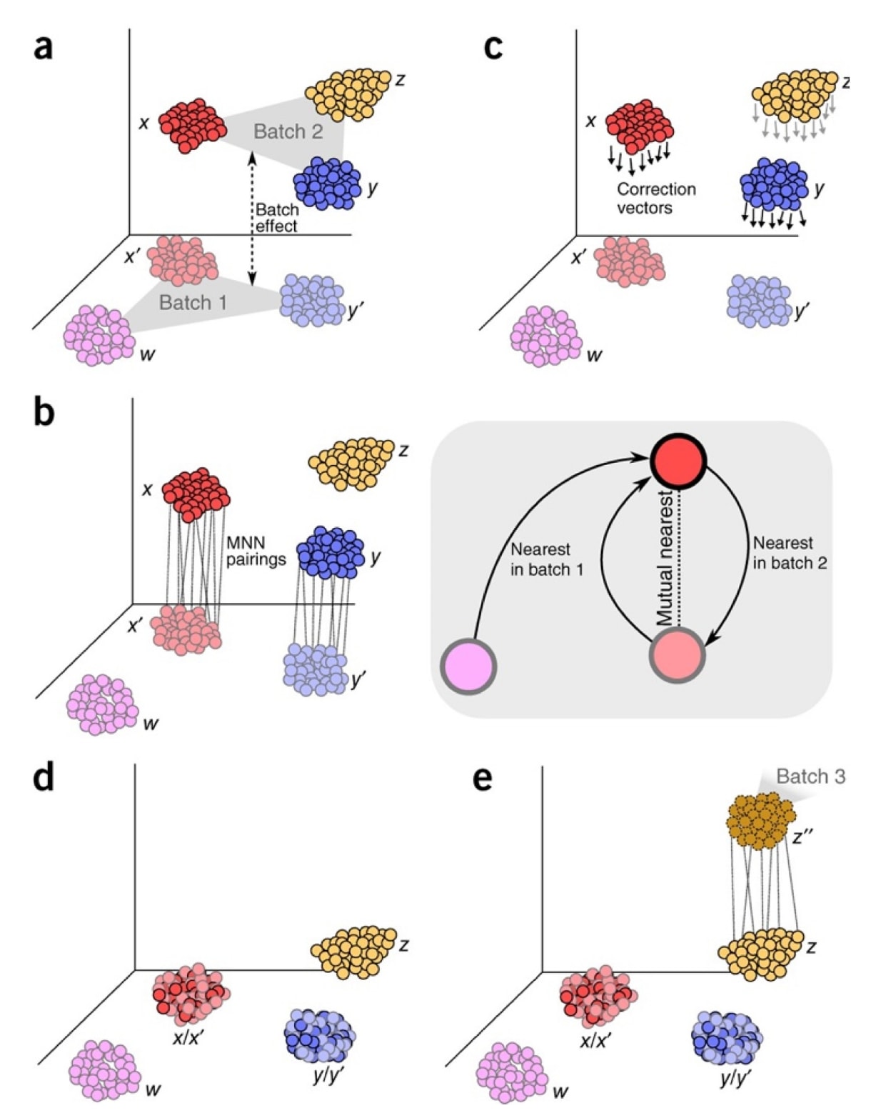 图3 | 通过互为最近邻(MNN)进行批次效应校正示意图。 (a) 在高维空间中,批次1与批次2存在几乎正交的批次效应差异。(b) 通过识别细胞间的MNN配对,算法能够找到匹配的细胞类型(灰色框所示)。(c) 在每一对MNN细胞之间计算批次校正向量。(d) 将批次1作为参考,通过减去校正向量将批次2的数据对齐并整合至参考批次。(e) 整合后的数据作为新的参考,用于与后续批次重复该校正与整合过程。