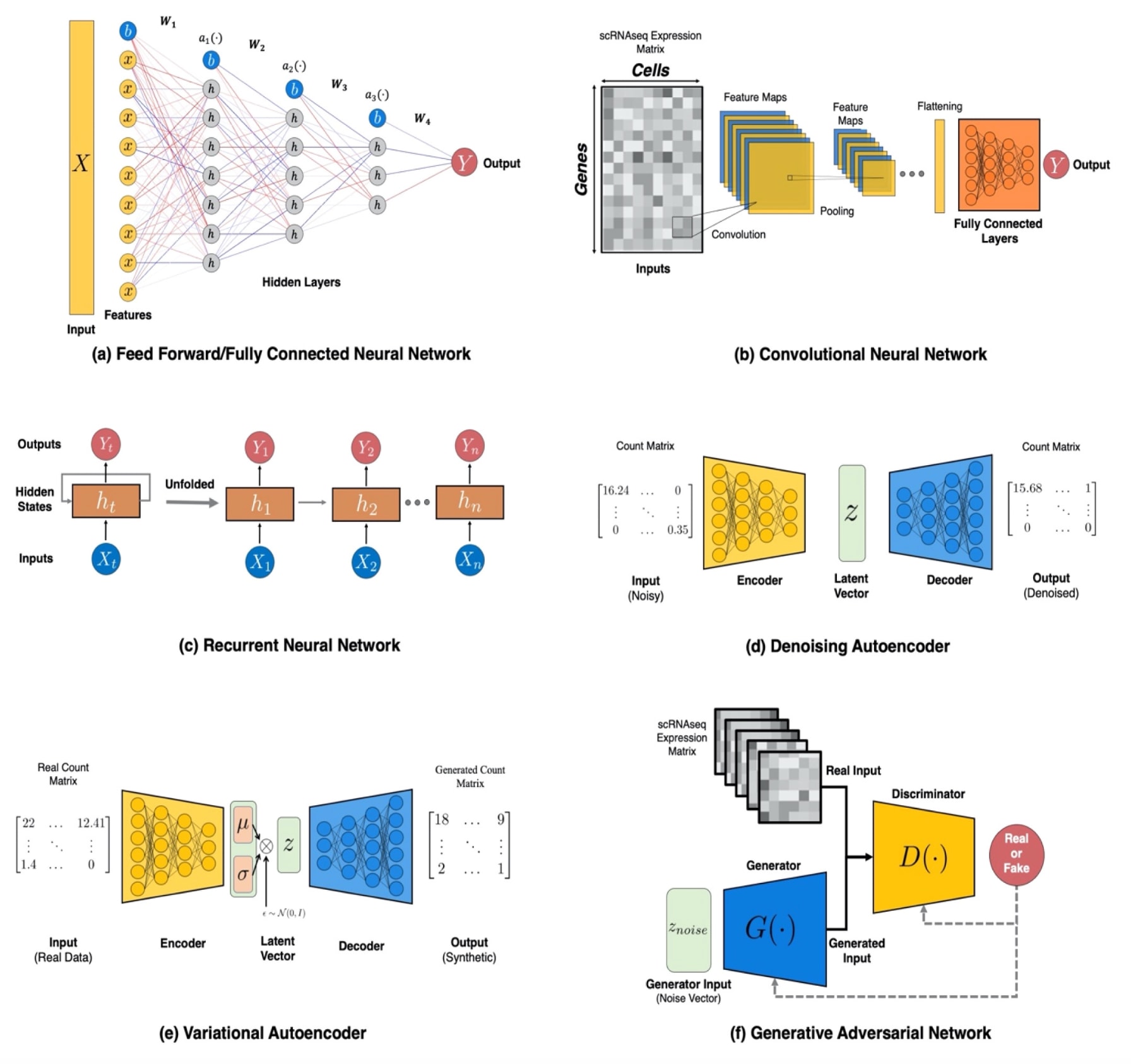 图1 (a) 前馈神经网络(FFNN)的结构示例。原始输入以X表示,权重张量记为Wi,激活层为αi,蓝色节点b表示偏置项。图中蓝色边代表正权重,红色边代表负权重,数值越小边的透明度越高,反之越深。(b) 卷积神经网络(CNN)用于分类的结构示例。在此假设性结构中,模型将输入依次经过三个卷积阶段(未绘出非线性激活部分)以提取特征,CNN输出随后输入至全连接神经网络以完成分类任务。(c) 循环神经网络(RNN)的结构与训练流程示意图。展开后的结构显示了依赖时间步长的输入、隐藏状态与输出的对应关系。(d) 去噪自编码器(Denoising AE)的示意图。自编码器由编码器与解码器组成,编码器用于提取关键信息并将其映射至潜在空间(通常维度远小于输入空间),解码器则接收编码器生成的潜在向量z,并将其还原至原始输入维度,实现数据重构。(e) 变分自编码器(VAE)的结构示意图,其目标是利用基因表达值生成合成的scRNA-seq数据。(f) 生成对抗网络(GAN)的示意图,用于生成模拟的scRNA-seq数据。在此示例中,scRNA-seq计数矩阵被转换为图像形式,并作为真实样本用于模型训练。