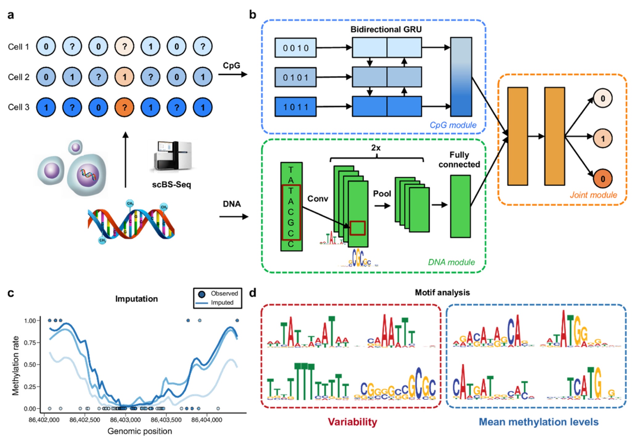 图5 | DeepCpG模型示意图(引自Angermueller等人)。 (a) 由Smallwood等人开发的scBS-seq与Farlik等人提出的scRRBS-seq可获得稀疏的单细胞CpG甲基化图谱,这些数据经过预处理后被编码为二值形式:甲基化位点标记为1,未甲基化位点标记为0,而甲基化状态未知(缺失数据)的CpG位点以问号表示。(b) 在DNA模块中,模型通过两个卷积层与池化层检测局部序列上下文中的预测性基序,并利用一个全连接层对不同基序间的相互作用进行建模。在CpG模块中,采用双向门控循环单元(GRU)扫描多个细胞的CpG邻域(图中每行代表一个细胞),并将提取的信息压缩为固定长度的向量。联合模型进一步学习DNA模块与CpG模块生成的高层特征之间的关联,以预测所有细胞的甲基化状态。(c, d) 经过训练后的DeepCpG模型可用于多种下游任务,例如全基因组范围内的CpG位点缺失值插补(c),以及识别与DNA甲基化水平或细胞间变异相关的DNA序列基序(d)。