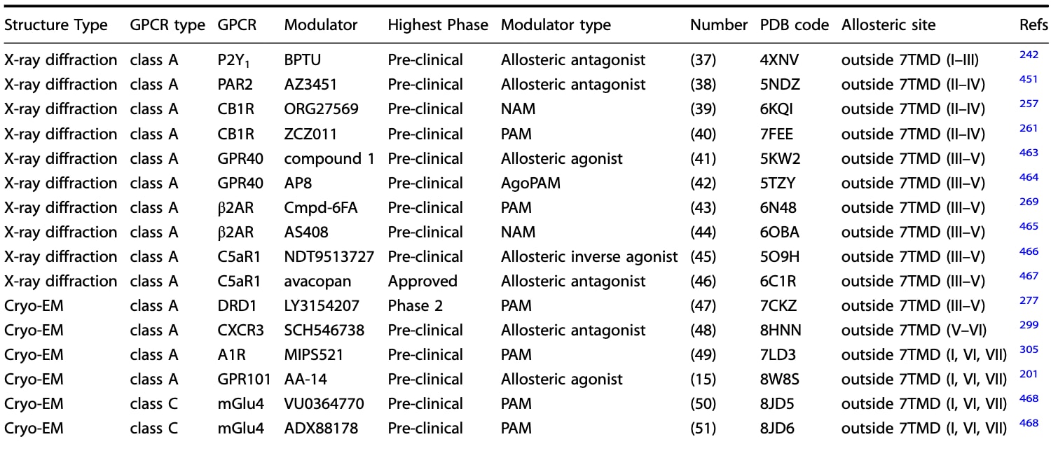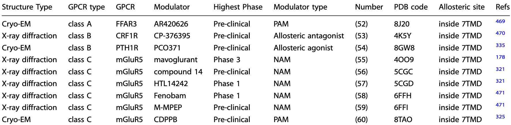 表3|与合成变构调节剂在7TMD内部跨膜结构域结合的GPCR复合物结构已被解析