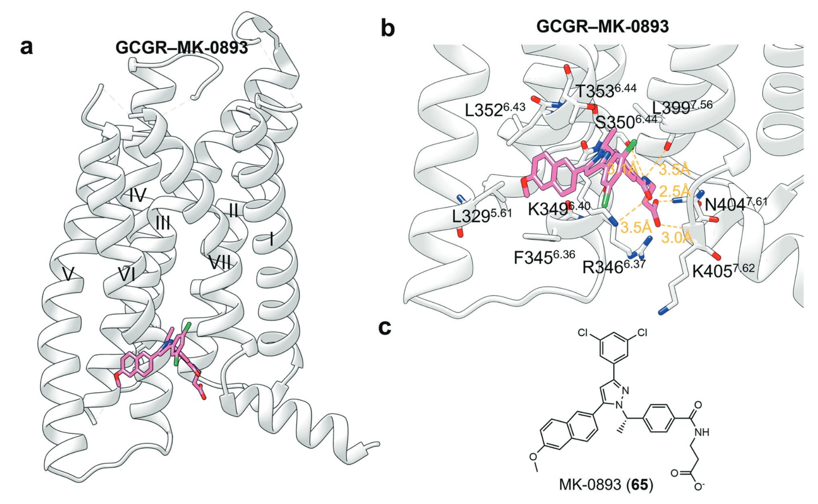 图34 a 展示了变构拮抗剂MK-0893与GCGR结合的示意图(PDB: 5EE7)。b 描述了MK-0893与GCGR的详细结合模式,氢键以橙色虚线标示。c 展示了小分子变构配体MK-0893的二维化学结构,用于辅助理解其构成与结合特征。