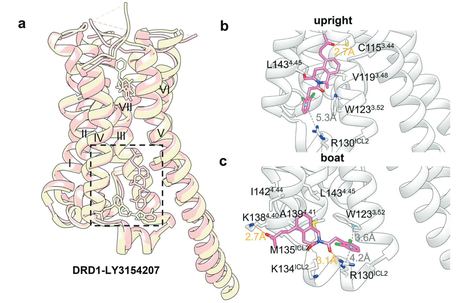 图23 a 展示了PAM LY3154207与多巴胺D1受体复合物在upright构象(粉色,PDB: 7CKZ)与boat构象(黄色,PDB: 7LJC与7X2F)中的共晶结构叠合图,用以对比其两种结合姿态的空间差异。b 描述了LY3154207在upright构象下与D1受体的详细结合模式,包括关键疏水作用、氢键及芳香相互作用,其中氢键以橙色虚线标示。c 展示了LY3154207在boat构象下的结合模式,重点呈现其与受体残基之间的π–π堆积及π–阳离子作用(以灰色虚线表示),以及与周围残基形成的其他相互作用。