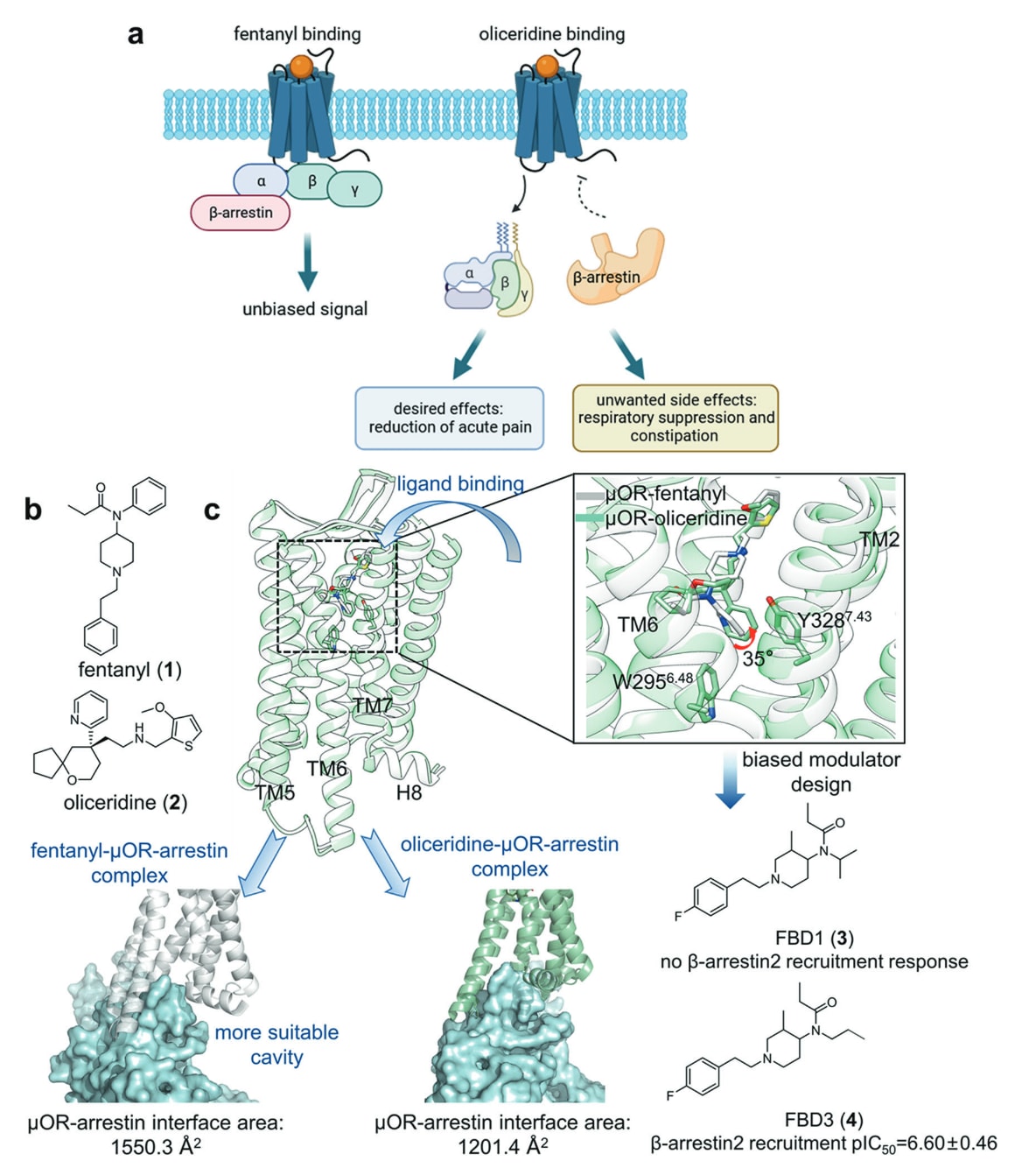 图5 a 芬太尼与oliceridine导致不同药理效应的整体示意。b 芬太尼与oliceridine的二维结构示图。c μOR−fentanyl(灰色)与μOR−oliceridine(浅绿色)复合物结构的叠合视图,并展示配体结合模式与arrestin耦联界面的比较,同时给出两种设计的偏向性调节剂的二维结构。