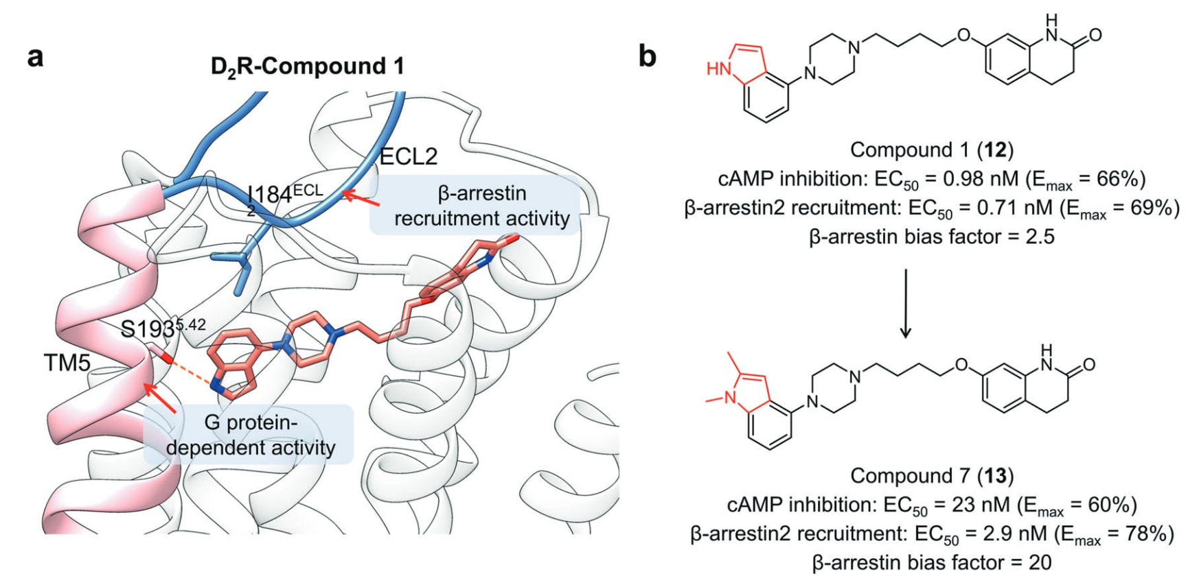 第二个案例展示了以aripiprazole为起点,通过结构指导设计偏向β-arrestin的D2R激动剂,以降低抗精神病药物常见的运动障碍副作用。研究者首先将aripiprazole的二氯苯基哌嗪部分替换为吲哚哌嗪,得到化合物12,其在Gi/o介导的cAMP抑制与β-arrestin2募集实验中表现出相当活性。分子对接显示12的吲哚NH可与Ser^5.42形成氢键,而此残基已知在β2肾上腺素受体中介导G蛋白信号,因此研究者在吲哚NH上引入甲基,以调整结合构象并避免TM5参与(图11a)。参考同源5-HT2B受体结构中配体与ECL2疏水残基的关键互作,研究者进一步在吲哚2位加入第二个甲基,得到偏向β-arrestin的化合物13,其偏向因子达20,并可能减少副作用(图11b)。据目前资料,这是首次利用结构信息理性设计GPCR偏向性配体的成功案例,突显了在SFSR研究中进行结构比较的必要性。
