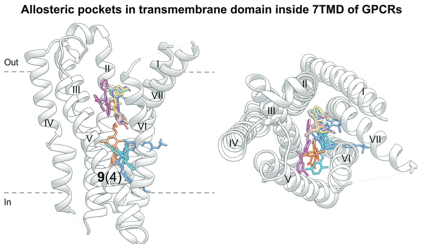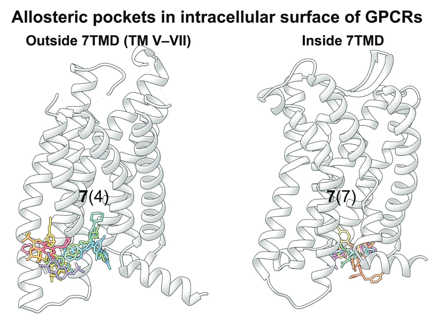 结合于跨膜结构域(7TMD外侧)的变构调节剂通常通过稳定受体外侧的活性或非活性相互作用网络、或阻碍或促进受体活化过程中必需的跨螺旋运动,从而调节GPCR信号转导。换言之,它们从7TM螺旋束外部调控受体功能,呈现出不同于传统正构调节的独特机制。