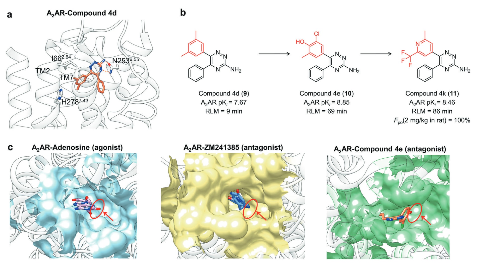 第一个例子是通过SBDD策略高效研发并优化A2AR选择性拮抗剂1,2,4-三嗪衍生物4d(9)。通过生物物理映射(BPM)与晶体结构分析可知,4d主要通过三嗪核心与N253^6.55形成的两个氢键稳定结合,其A环朝向TM2与TM7(图10a)。基于此,研究者提出在A环对位引入氢键受体以与His278^7.43互作,并在同一芳环引入疏水取代基与Ile66^2.64作用作为SAR优化方向。通过在A环对位加入苯酚羟基或4-吡啶氮,并结合其他小体积脂溶性取代基进行亲和力微调,成功获得效能最佳的4k(图10b)。进一步比较A2AR分别与腺苷(激动剂)、ZM241385(拮抗剂)以及4e(拮抗剂)的结合口袋可知,腺苷类激动剂会以核糖环填充下部腔体的疏水亚口袋,而拮抗剂结合时该区域通常空置。此外,该区域亦可用于提升A2AR相对A1AR的选择性(图10c)。因此,将新化学骨架拓展至该区域有望进一步提升功能多样性与选择性。