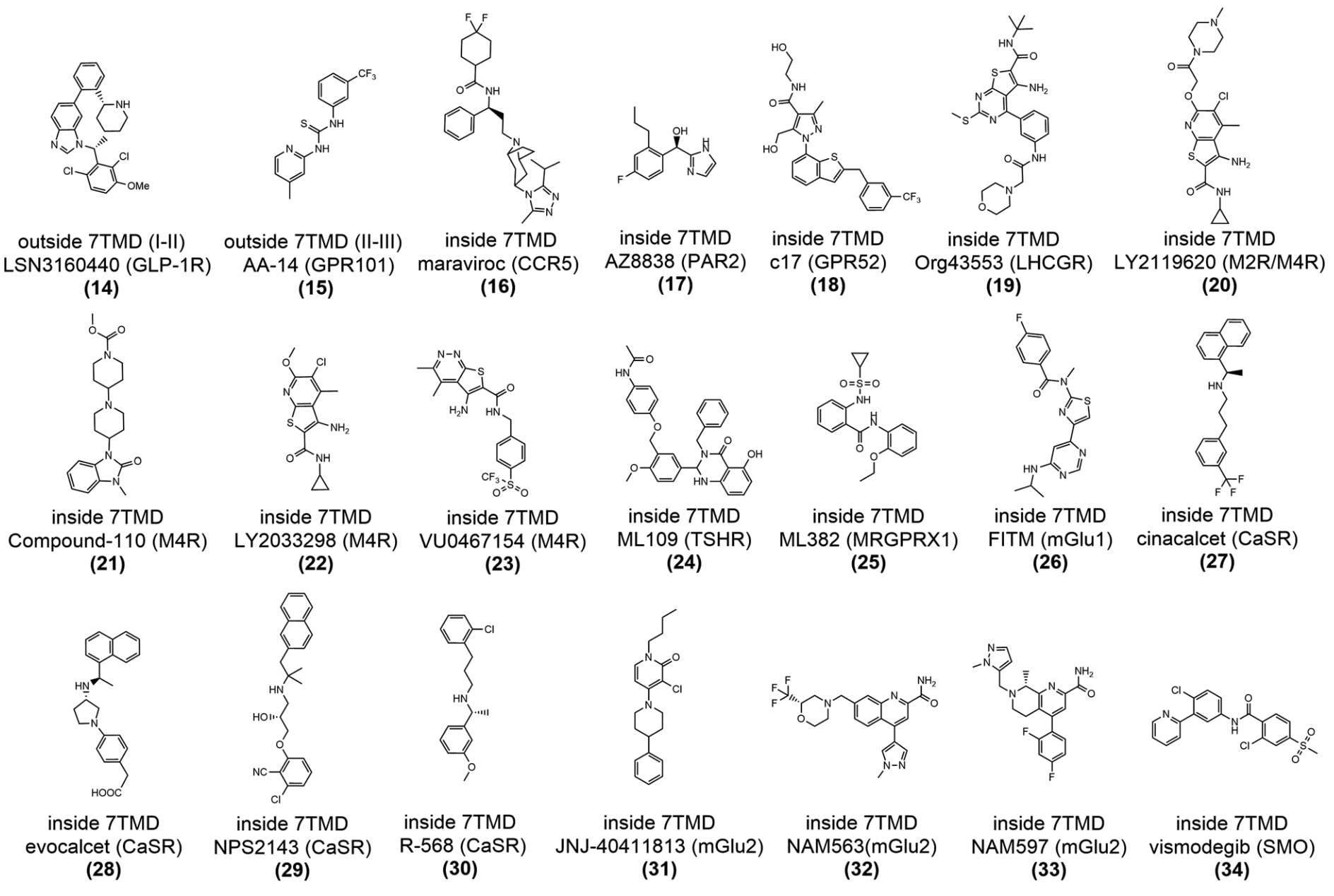 图28 展示了靶向GPCR 7TMD内部跨膜结构域的各类小分子合成变构配体的二维化学结构。