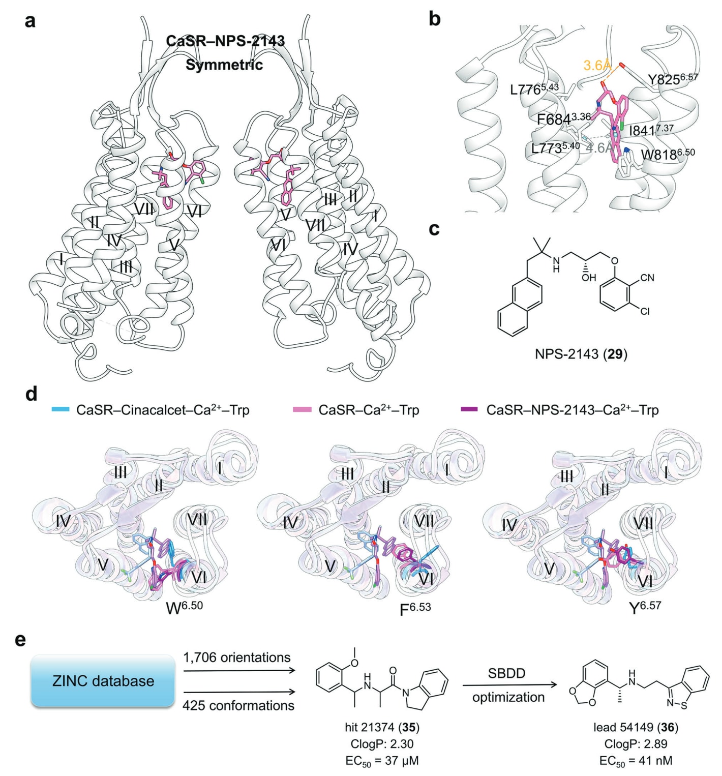 图19 a NAM NPS-2143 与 CaSR 结合的示意图(PDB: 7M3E)。b CaSR–NPS-2143 复合物的详细结合模式。氢键以橙色虚线表示,π–π 堆叠以灰色虚线表示。c 小分子变构配体 NPS-2143 的二维化学结构,用于清晰展示。d CaSR 在不同配体结合状态下关键残基的叠合结构:CaSR–Cinacalcet–Ca²⁺–L-Trp(蓝色卡通与蓝色棒,PDB: 7M3F);CaSR–Ca²⁺–L-Trp(粉色卡通与粉色棒,PDB: 7DD6);CaSR–NPS-2143–Ca²⁺–L-Trp(紫色卡通与紫色棒,PDB: 7M3E)用于展示 Trp818^6.50、Phe821^6.53、Tyr825^6.57 等关键残基在不同配体作用下的构象差异。e 利用 CaSR 结构信息发现新型 CaSR PAM 的流程示意,包括构象采样、虚拟筛选、片段拼接与立体化学优化等步骤。