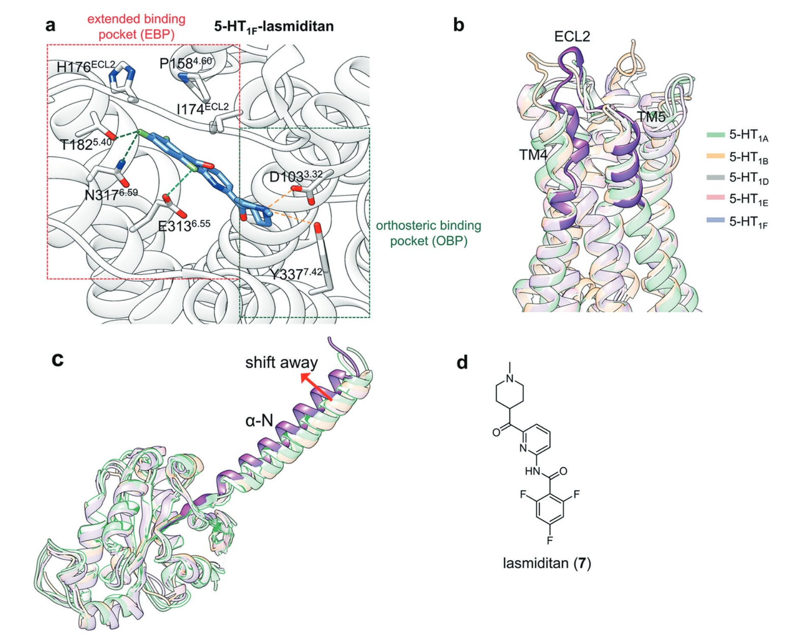 Huang等人解析了5-HT1F−lasmiditan−Gi1复合物结构,呈现lasmiditan的整体结合模式。在正构结合口袋中,配体上甲基哌啶基团的伯胺通过与Asp103^3.32形成经典的电荷互作,并同时与Tyr337^7.42形成氢键,从而大幅稳定配体。在其延展结合口袋(EBP)中,lasmiditan的三氟苯基团通过疏水作用与Ile174^ECL2和Pro158^4.60相互作用,并与Glu313^6.55、Asn317^6.59、Thr182^5.40和His176^ECL2形成额外氢键。将5-HT1F与其他四个5-HT1亚型进行结构对齐后发现,其他亚型高度保守的TM4−TM5−ECL2区域在5-HT1F中发生显著构象变化,使lasmiditan无法在这些亚型中形成相同关键相互作用。因此,设计能够适配EBP并与TM4−TM5−ECL2区域产生特异作用的配体,有望实现高选择性5-HT1F激动(图8a、b)。