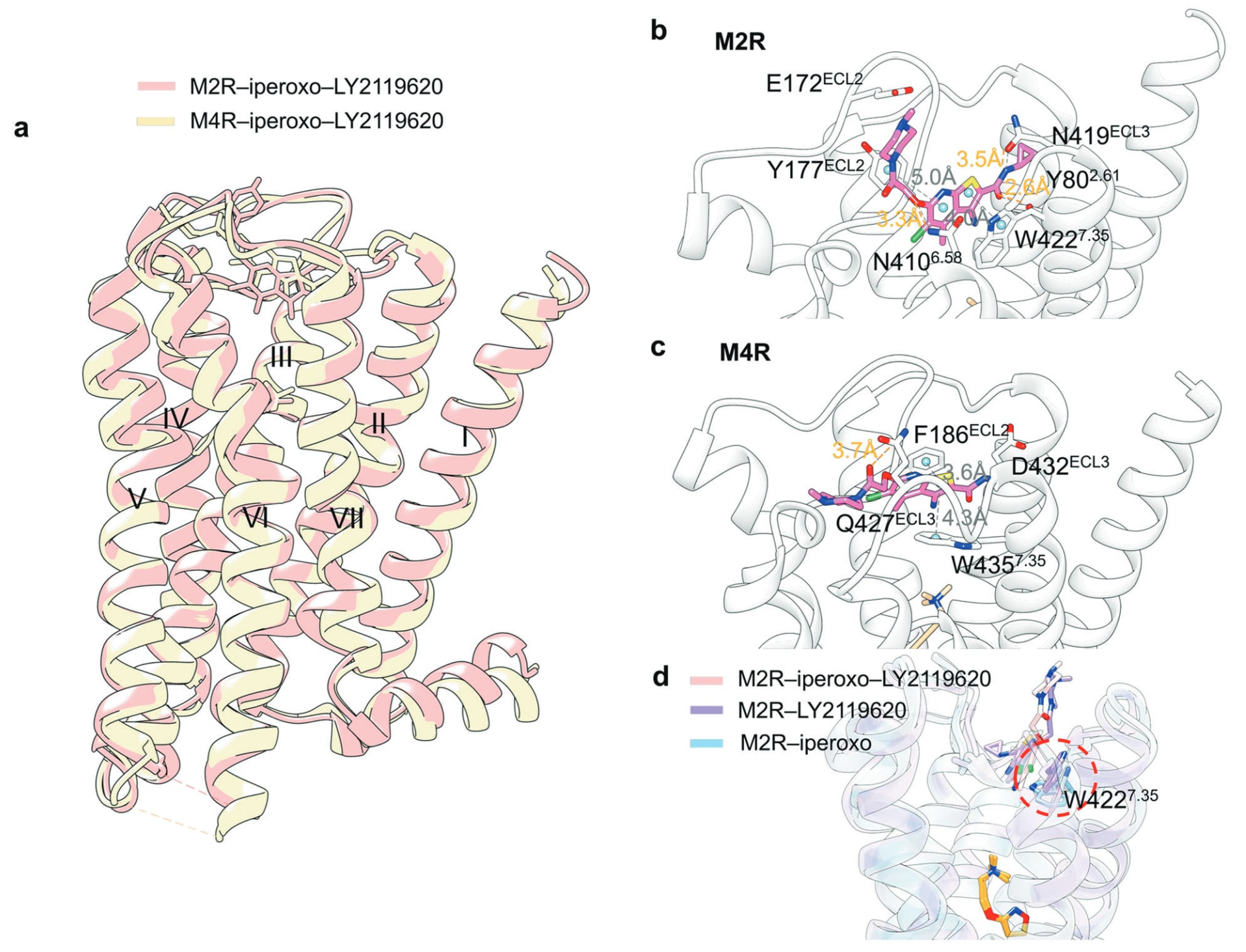 MD模拟显示,LY2119620可调节Trp422^7.35构象,继而驱动Tyr426^7.39在正构口袋中的重新定位,这可能解释其对正构激动剂亲和力提升的机制(图17d)。