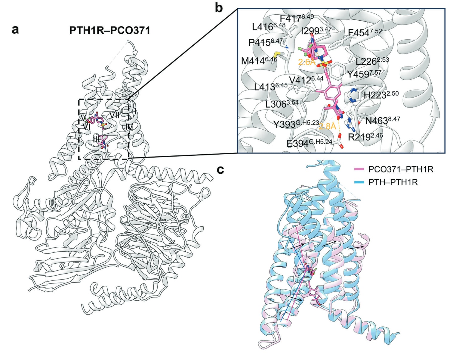 图30 a 展示了变构激动剂PCO371与PTH1R结合的示意图(PDB: 8GW8)。b 描述了PCO371与PTH1R的具体结合模式,其中氢键以橙色虚线表示。c 叠合显示了结合PCO371的PTH1R(粉色)与结合PTH的PTH1R(蓝色)之间的构象差异,呈现PCO371结合后受体结构发生的变化。