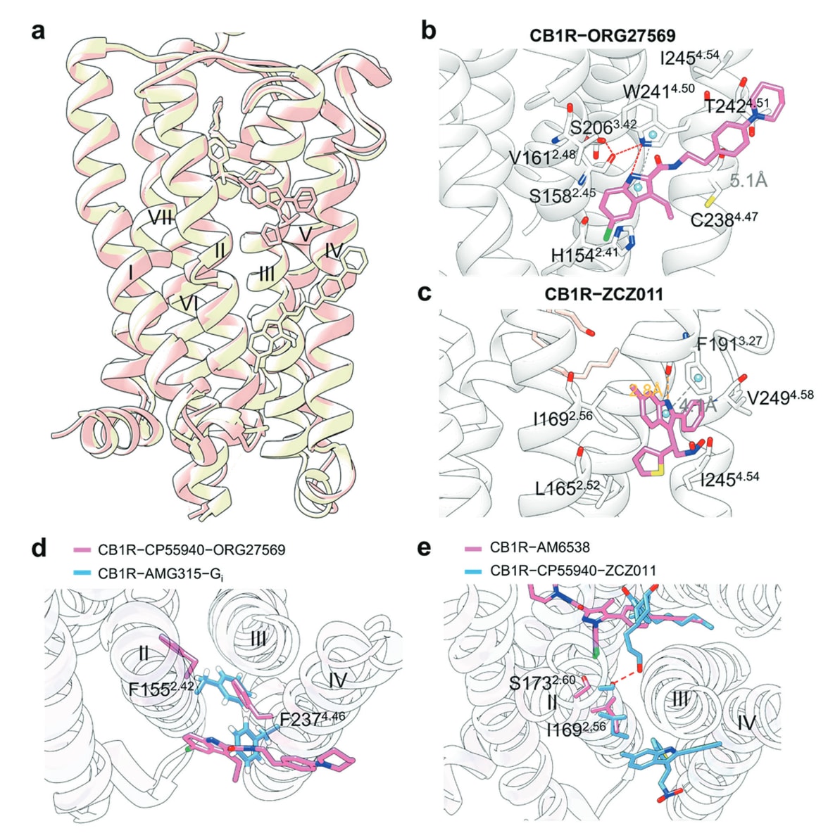 - TM II–IV:CB1R−ORG27569、CB1R−ZCZ011 与 PAR2−AZ3451 结构