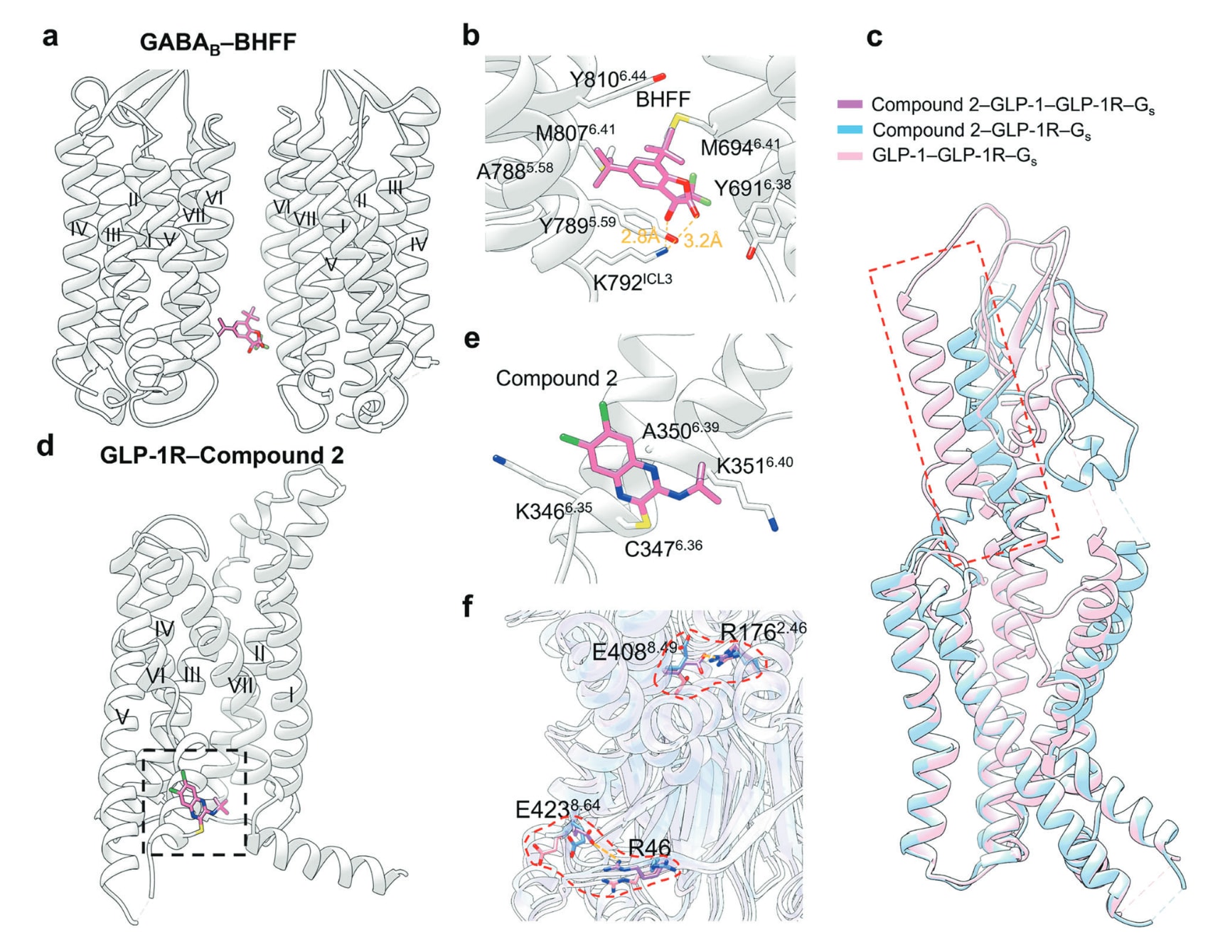 图33 a 展示了PAM BHFF与GABAB受体结合的示意图(PDB: 7C7Q)。b 描述了BHFF与GABAB受体的详细结合模式,其中氢键以橙色虚线表示。c 叠合展示了compound 2–GLP-1R–Gs结构(蓝色,PDB: 7DUR)与GLP-1–GLP-1R–Gs结构(粉色,PDB: 6×18)中N端α螺旋的构象差异。d 展示了ago-PAM compound 2与GLP-1R结合的示意图(PDB: 7EVM)。e 描述了GLP-1R结合compound 2的详细模式,包括疏水作用、共价键与极性相互作用。f 叠合呈现compound 2–GLP-1R–Gs(蓝色,PDB: 7DUR)、GLP-1–GLP-1R–Gs(粉色,PDB: 6×18)以及compound 2–GLP-1–GLP-1R–Gs(紫色,PDB: 7DUQ)结构中被重点标出的残基差异。